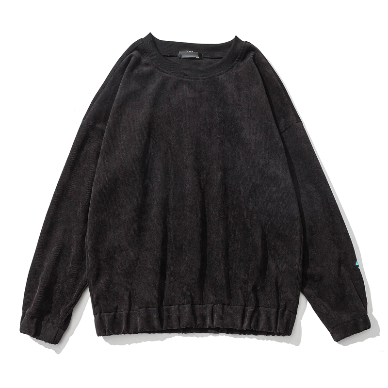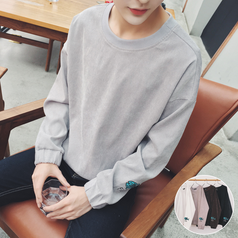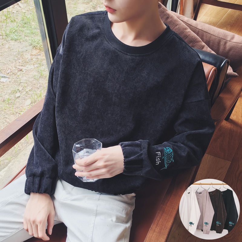 / 秋冬新款魚繡花圓領套頭薄款燈芯絨韓版男士衛衣