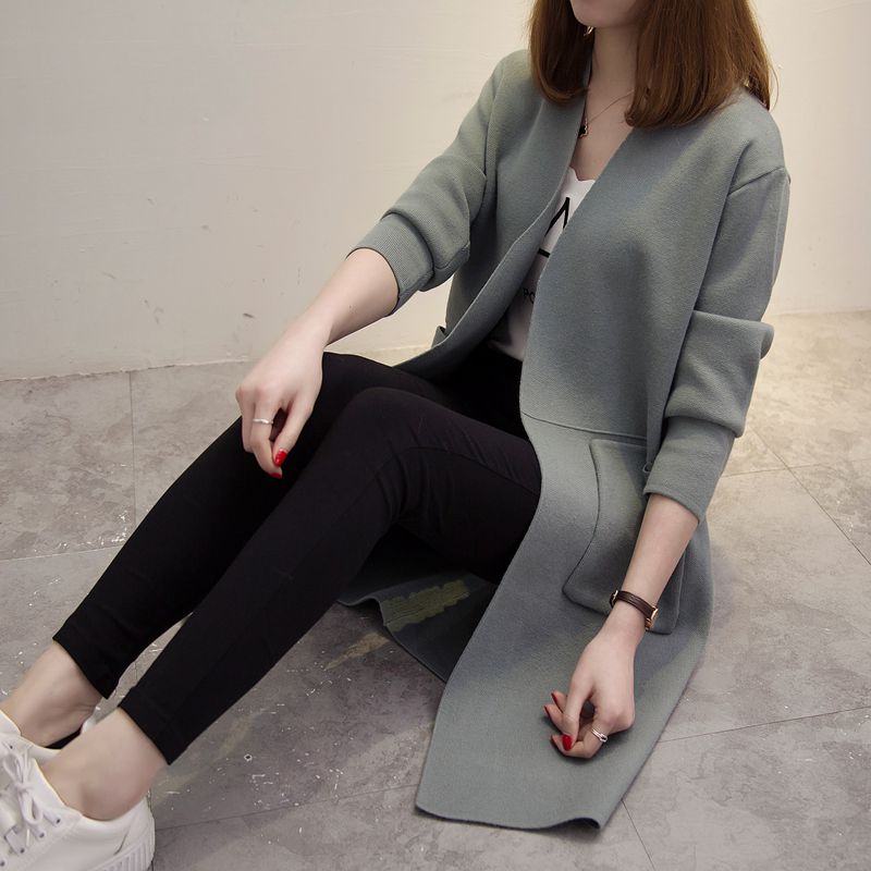 / 中長款寬松針織衫開衫韓版秋冬季新款女裝純色口袋毛衣外套女潮