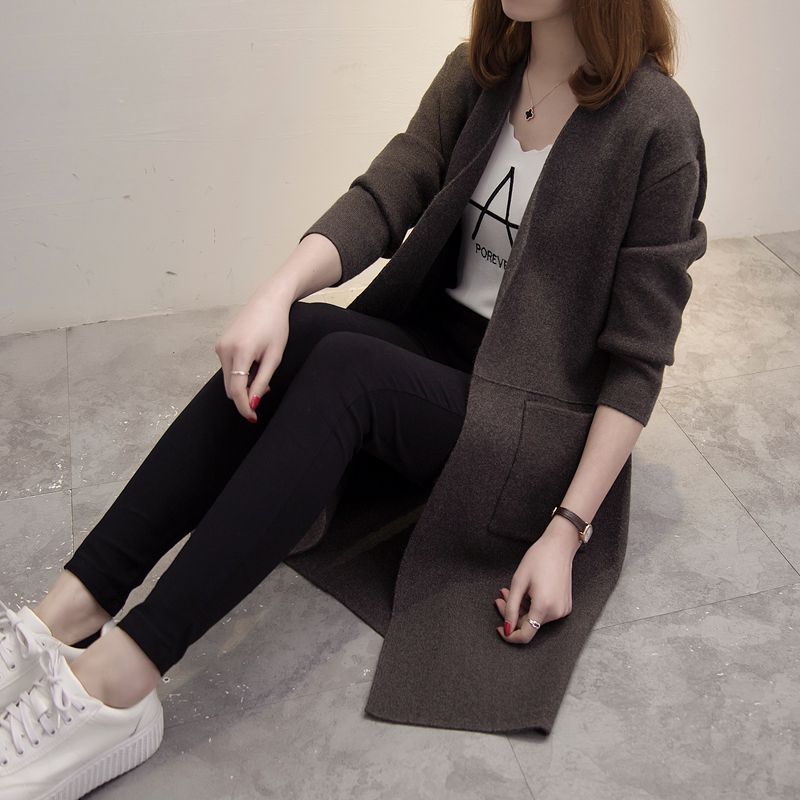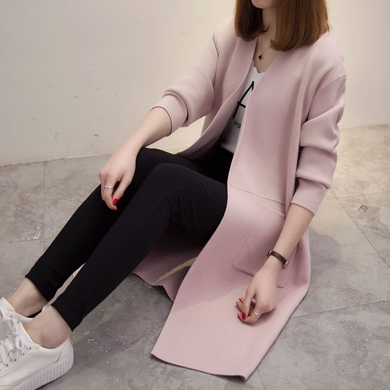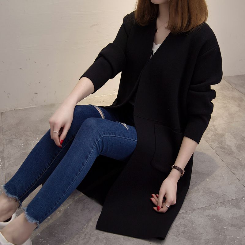 中長款寬松針織衫開衫韓版秋冬季新款女裝純色口袋毛衣外套女潮