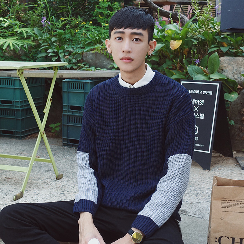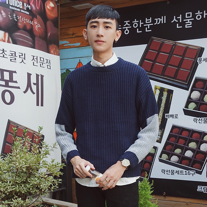 新款秋裝韓版男士拼色圓領寬松針織衫套頭毛衣外套