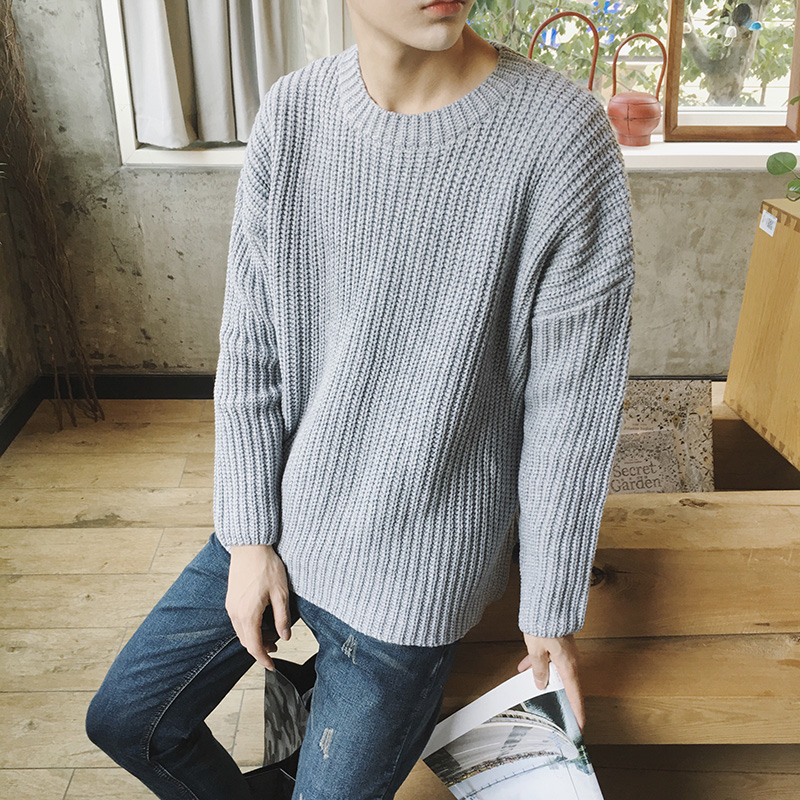 男裝新款韓版落肩圓領男士粗線毛衣寬松套頭針織衫