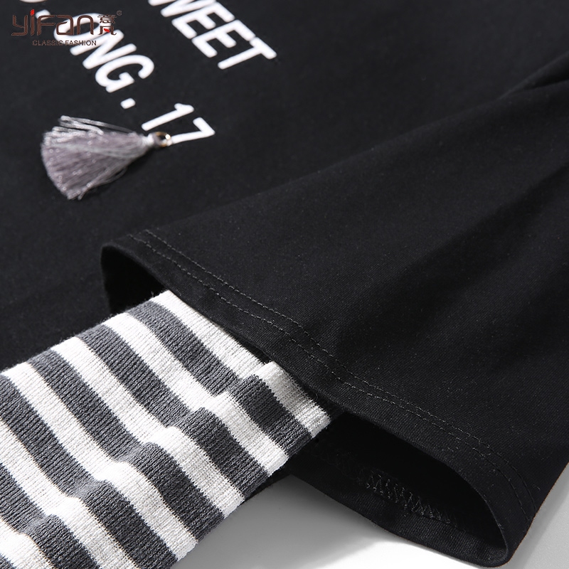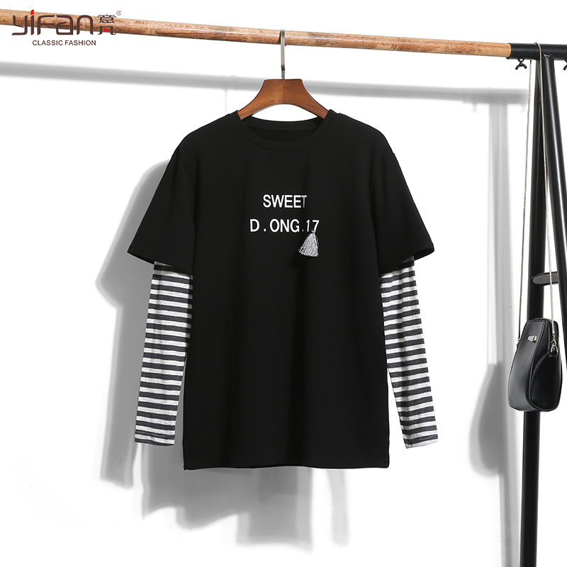 / 春秋寬松條紋長袖拼接休閑T恤韓版圓領套頭假兩件上衣女裝