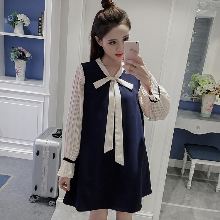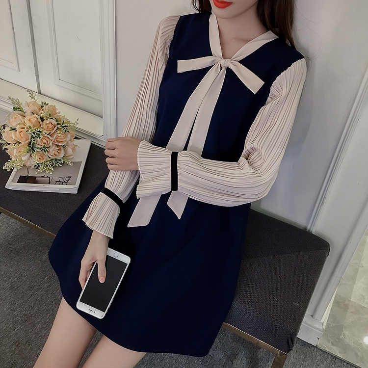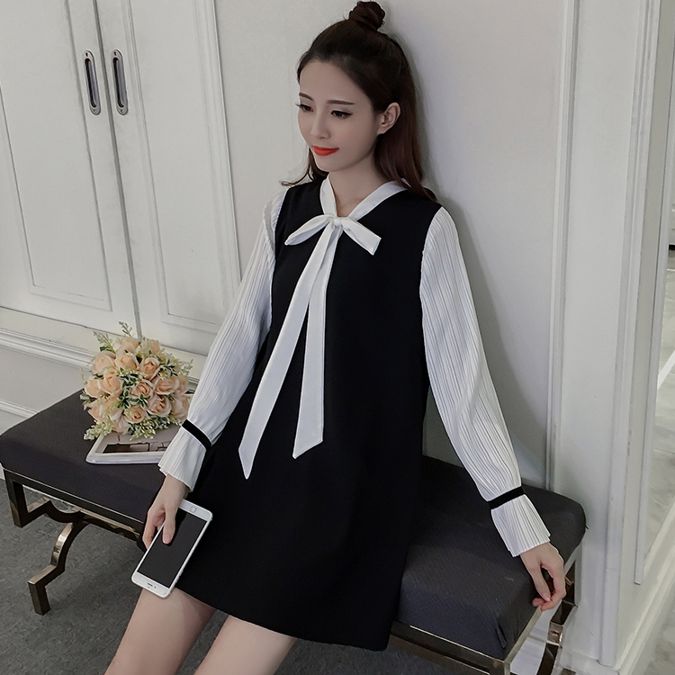 / 春裝新款女裝學院風拼接打底裙秋冬大碼顯瘦長袖雪紡連衣裙子