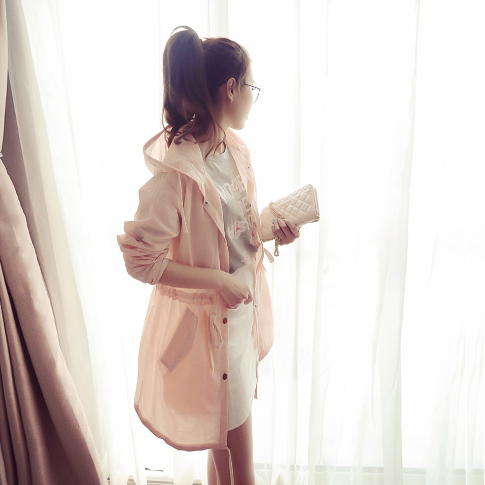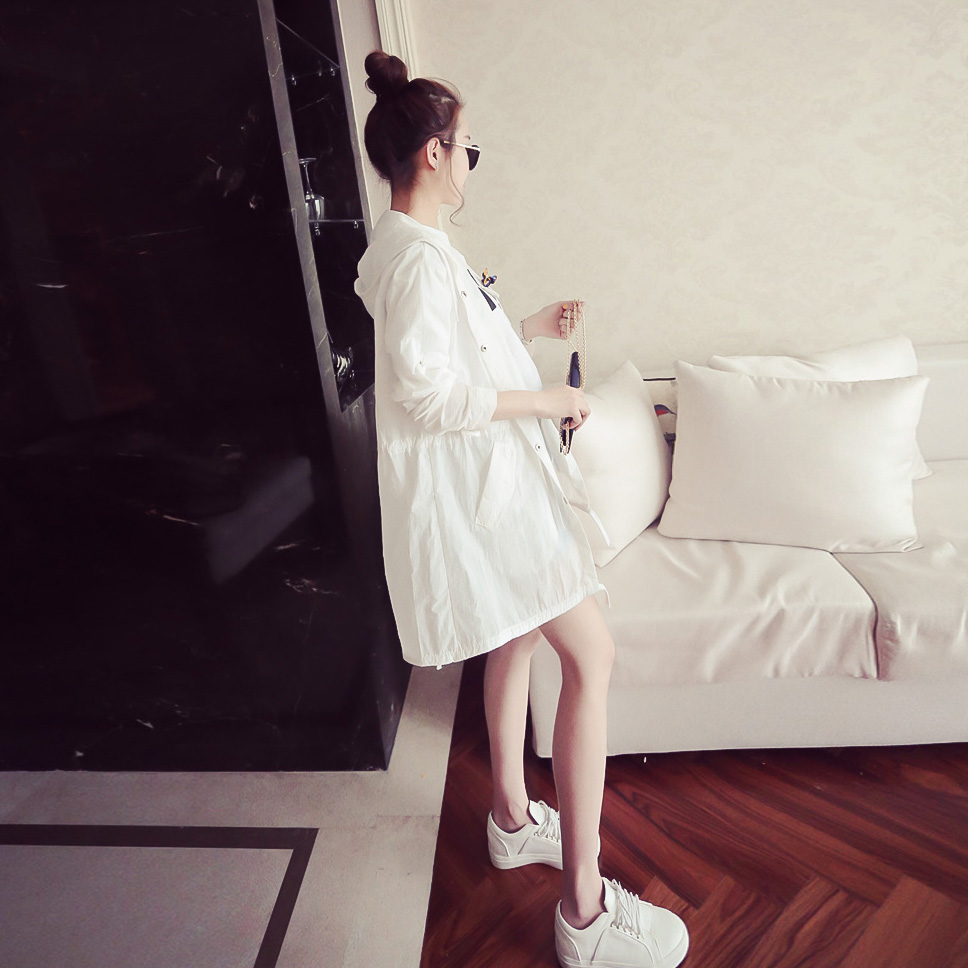 2017韓版新款春裝寬松中長款防曬衣收腰外套大碼連帽白色女風衣秋