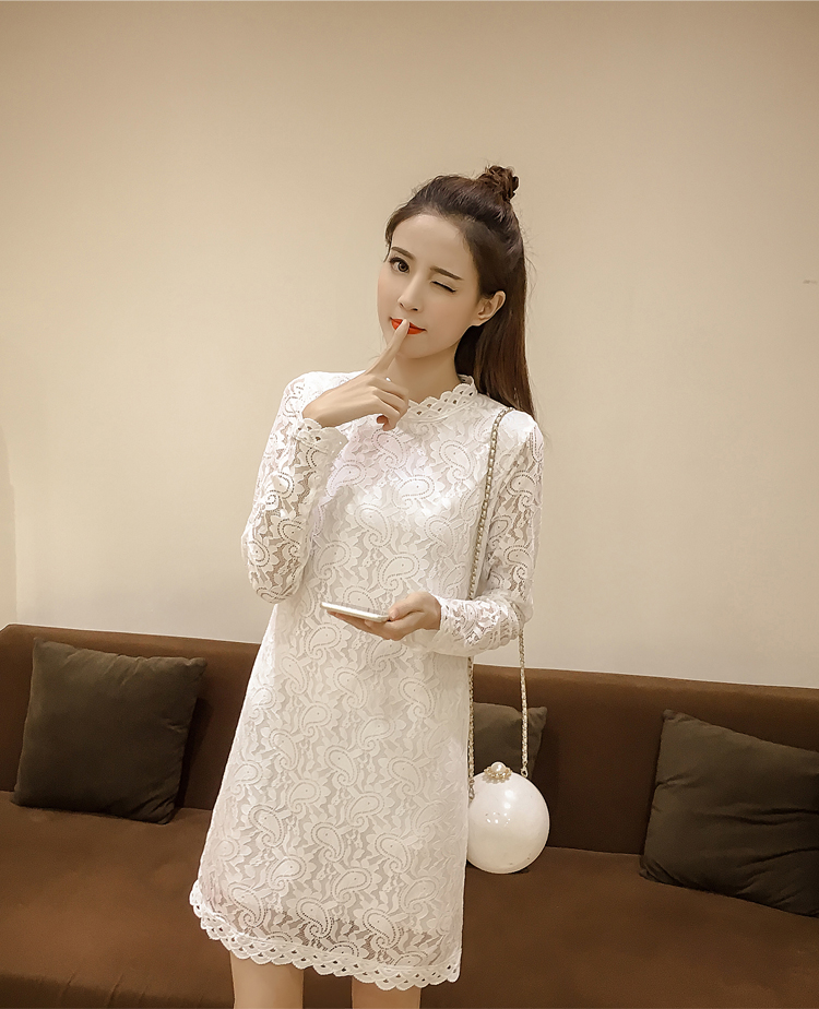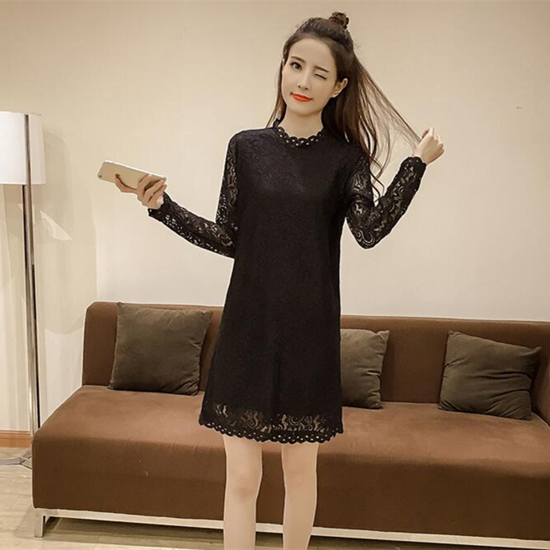 / 春裝新款女裝韓版中長款立領打底裙女顯瘦長袖蕾絲連衣裙秋冬