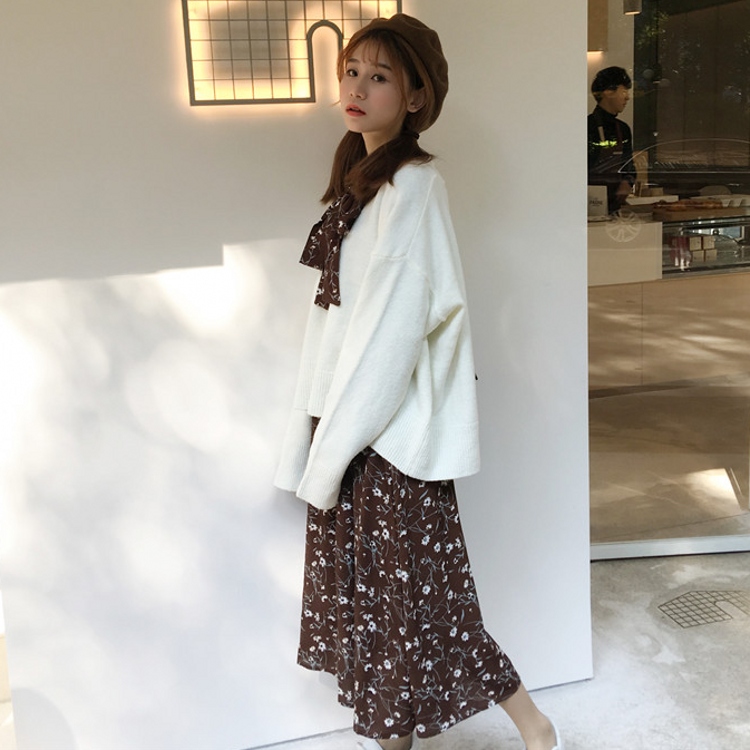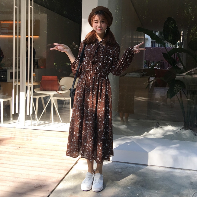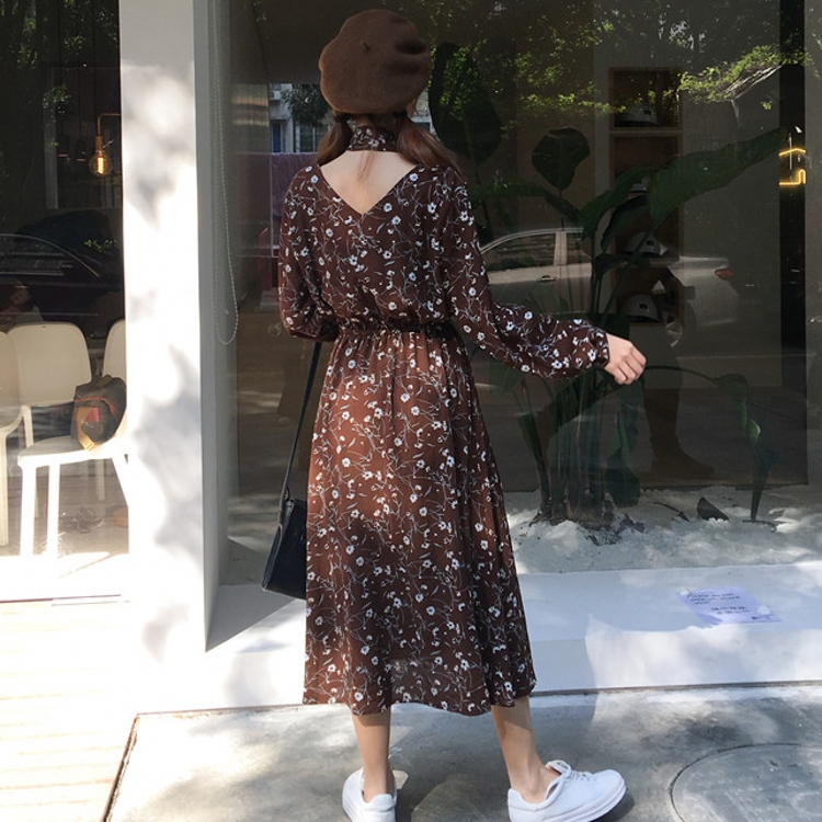 / 韓國復古chic秋冬款修身顯瘦前后v領長款碎花連衣裙女打底裙