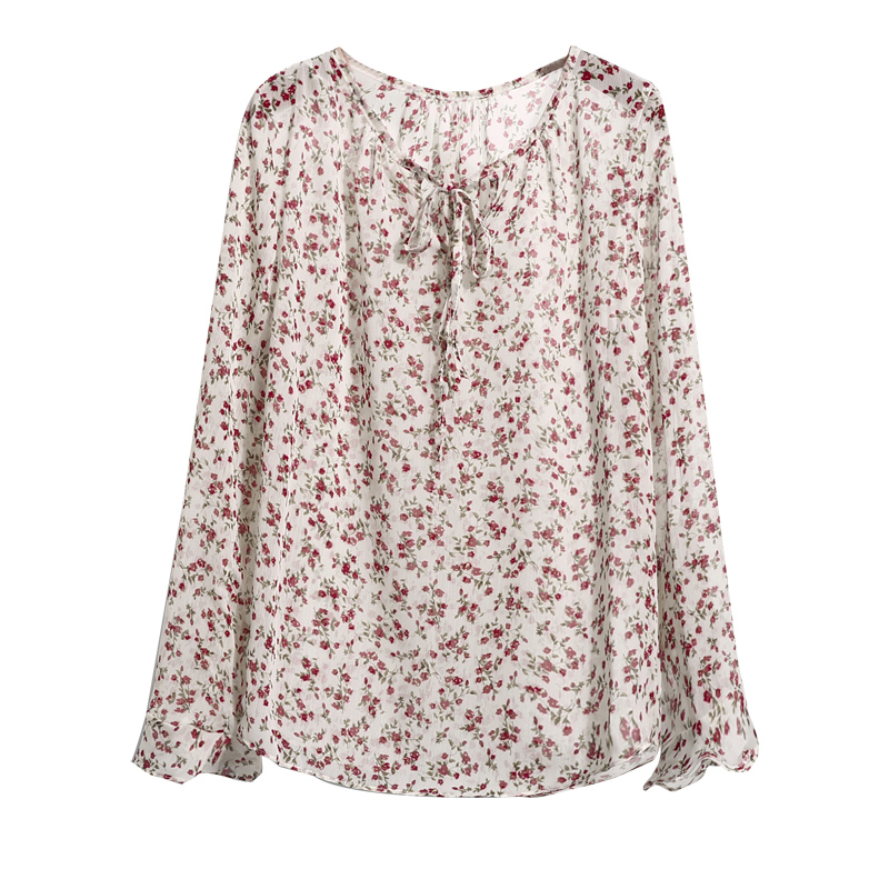 韓國新款瑞麗甜美寬松顯瘦綁帶雪紡上衣系帶喇叭袖碎花襯衫女長袖