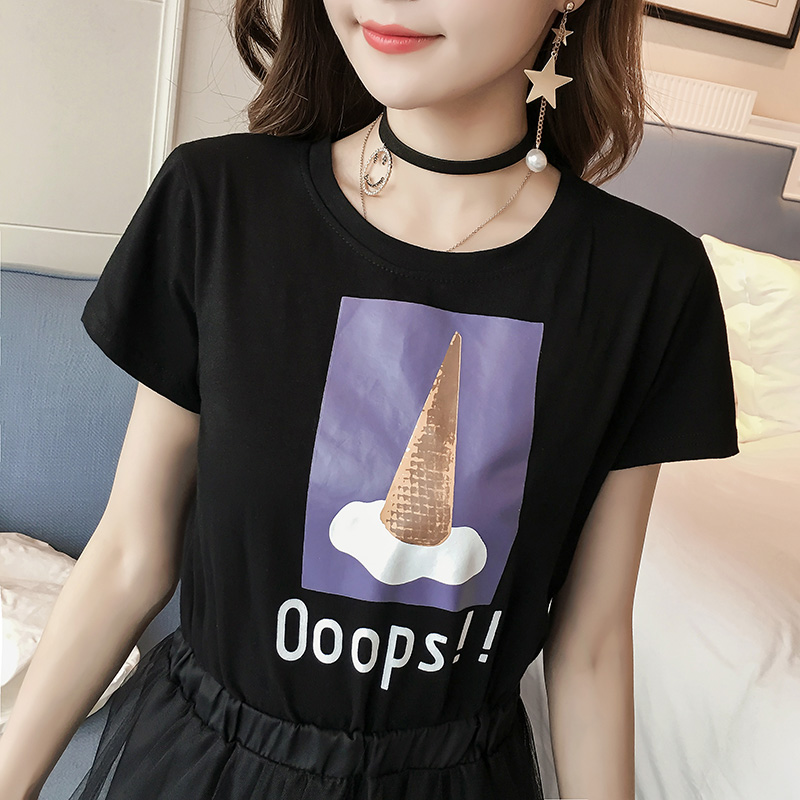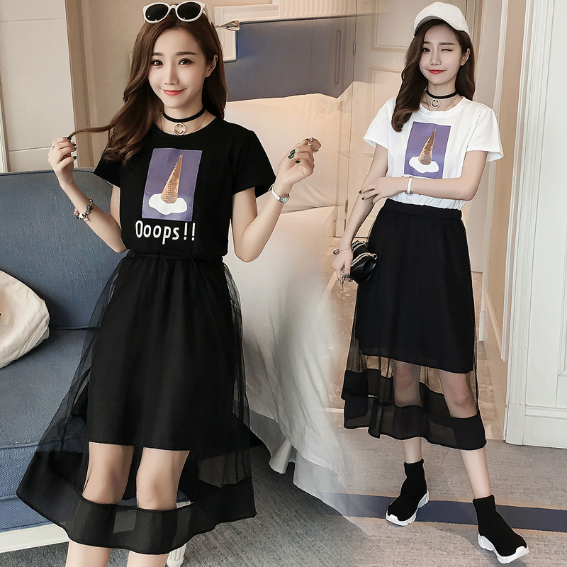 / 夏季新款女裝韓版印花短袖中長款網紗拼接修身顯瘦T恤連衣裙