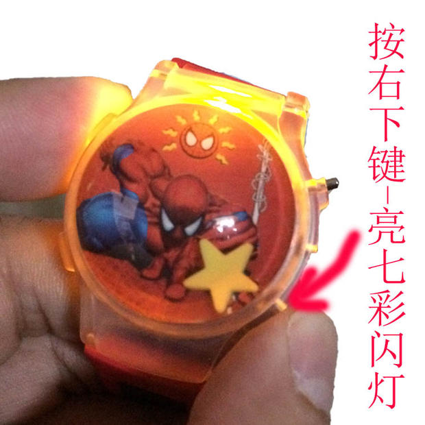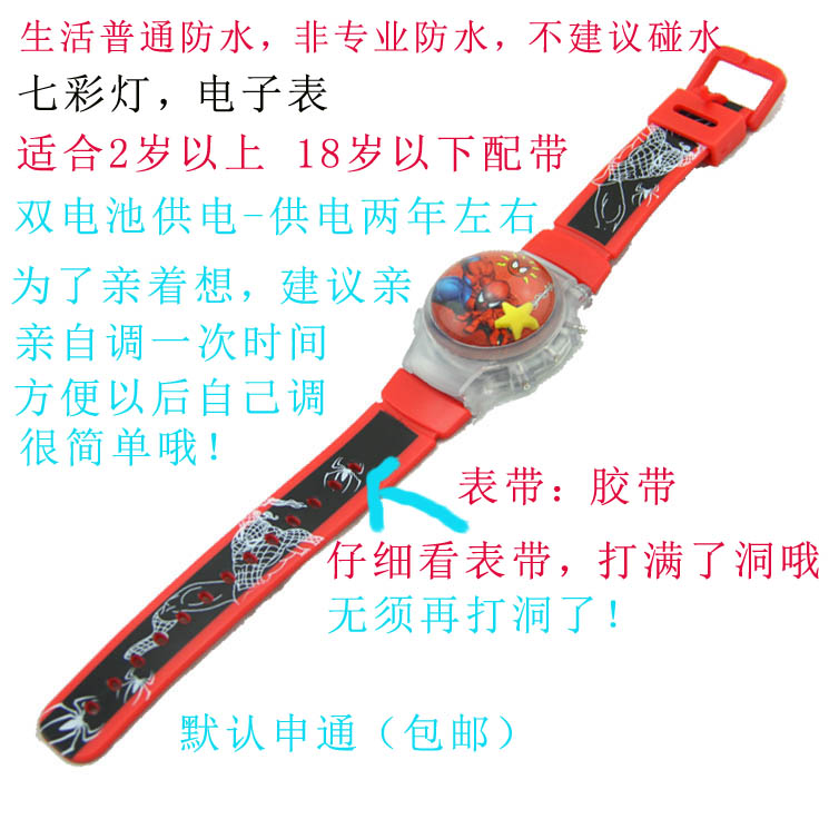 | 默認發申通(包郵) 精美包裝(送表合) 表帶為:膠帶,無毒,環保,無味 手表尺寸說明:表盤為約為3厘米表帶總長約為21厘 雙電池供電-電子表 帶七彩燈按右下鍵閃閃發光! 雙層表蓋,可以翻蓋打開! 親,本店兒童手表防水是普通生活防水! 非專業防水,所以為了手表壽命更長,請注意避免碰水就可以了!( 日常生活用防水(可防汗水、雨水或洗臉時的水滴。) 表帶為:膠帶,電子表,帶七彩燈,按右下鍵閃閃發光!雙層表蓋,可以翻蓋打開!生活防水,非專業防水!注意! 質量保證,兒童手表適合2歲以上18歲以下 如何調時間:用牙簽或者別的小工具按一下中間的健會“顯示日期”再按一次中間(進入調時狀態),再按右上健先調好月份(左邊為月份),調好再按中間鍵跳到調幾號(右邊為幾號)!調好再按中間“調小時”右邊會顯示R或者P( 時間R代表早上,P代表下午,一直按會由R轉為P)(調好小時)按中間鍵跳到(調分鐘)(按右上健),挑好再按中間健,則退出顯示時間!調好后,按上面的鍵,每按一次顯示時間,再按就顯示日期,再按就顯示秒! 親,認真看一下說明,試一下! |