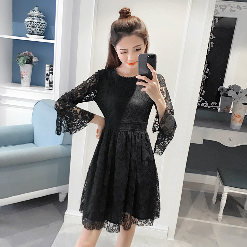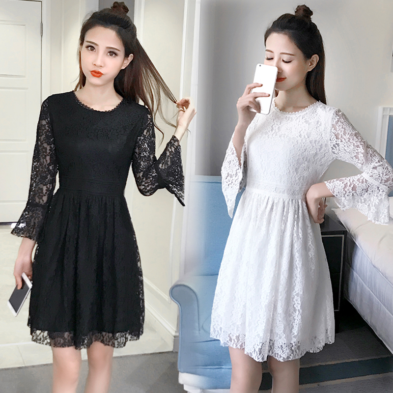 / 春裝新款女裝韓版喇叭袖打底裙女修身高腰長袖蕾絲連衣裙秋冬