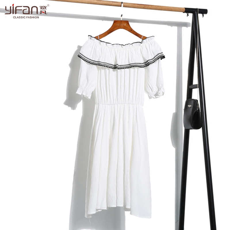 / 韓版夏裝一字領荷葉邊純色雪紡連衣裙甜美顯瘦短袖露肩修身中長裙