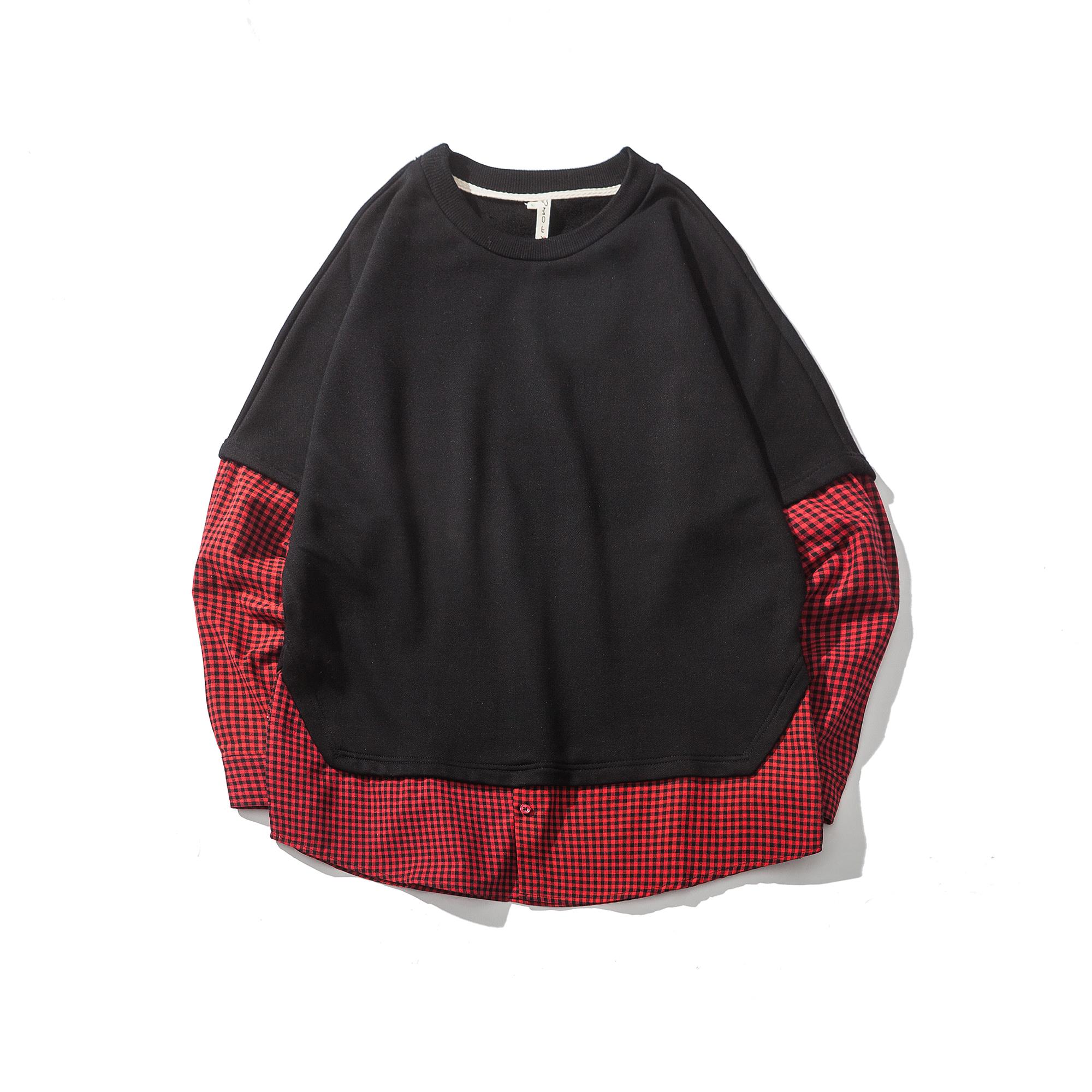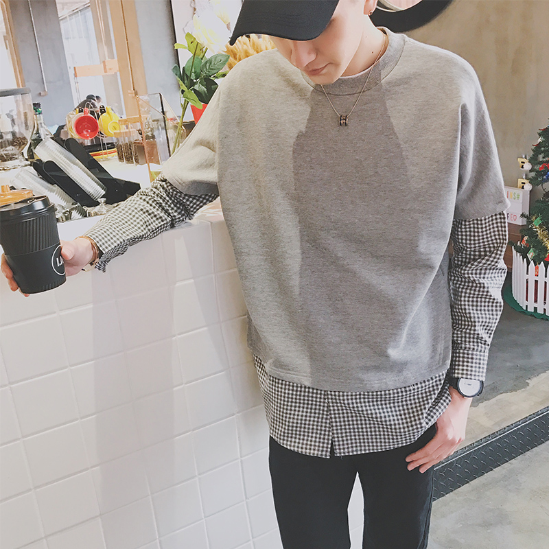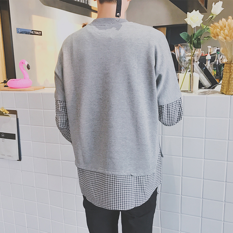 男裝韓版寬松細格子襯衫袖拼接男士套頭寬松衛衣