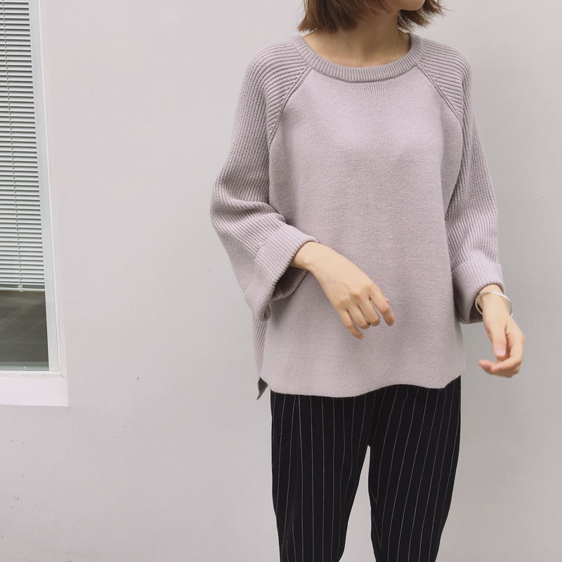 / 韓國秋冬款復古螺紋拼接大袖子翻邊前短后長套頭厚實短毛衣女