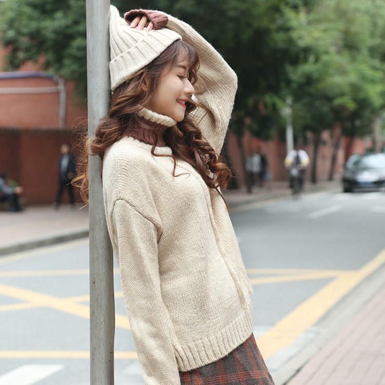 / 冬款韓國ulzzang加厚顯瘦高領套頭拼色微彈力寬松百搭毛衣女