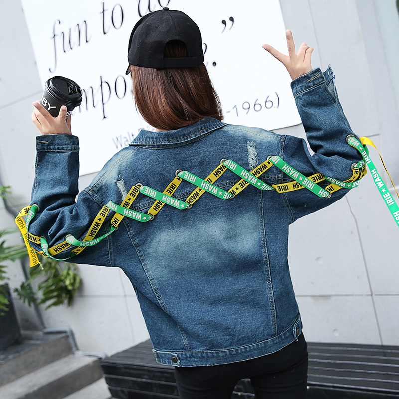 2017秋裝新款后背織帶牛仔外套長袖綁帶原宿女百搭韓版寬松學生潮