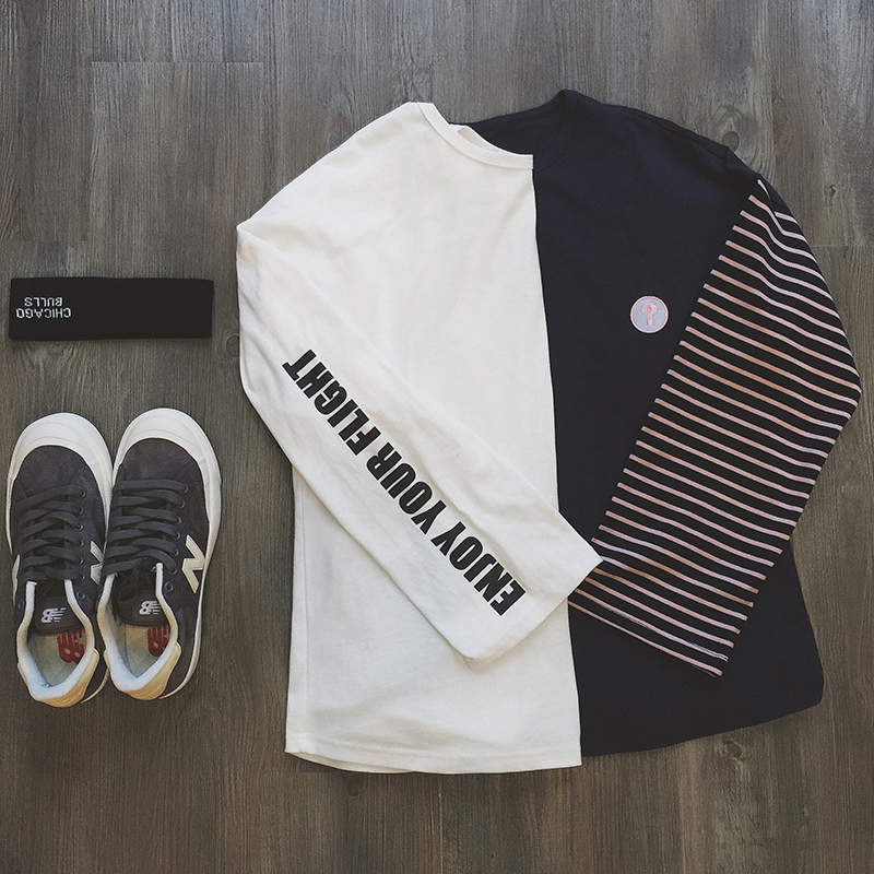 / 男裝韓版撞色圓領寬松條紋拼接袖男士衛衣外套
