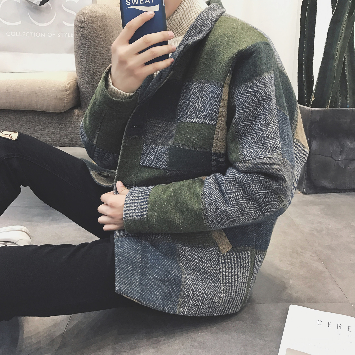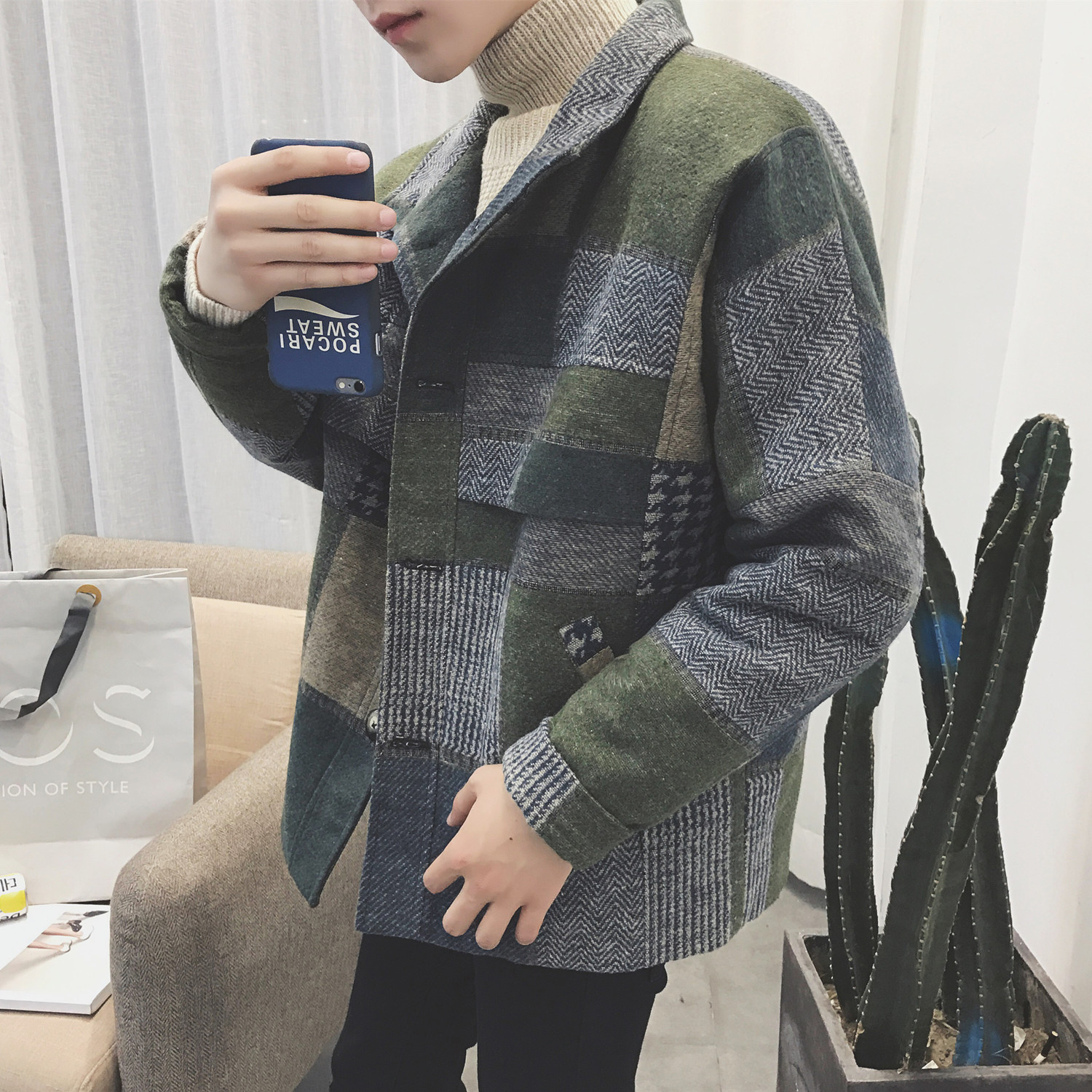 / 男士寬松風衣韓版潮流秋季港風復古格子毛呢外套短款大衣情侶裝男