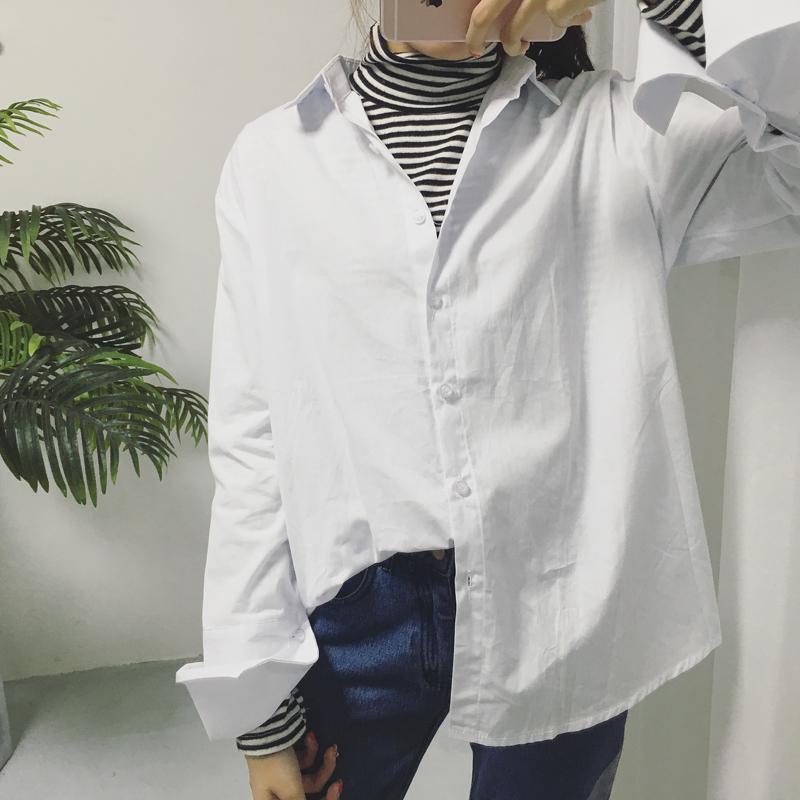 復古港味襯衫女長袖學生寬松原宿風bf條紋大碼喇叭袖百搭外穿襯衣