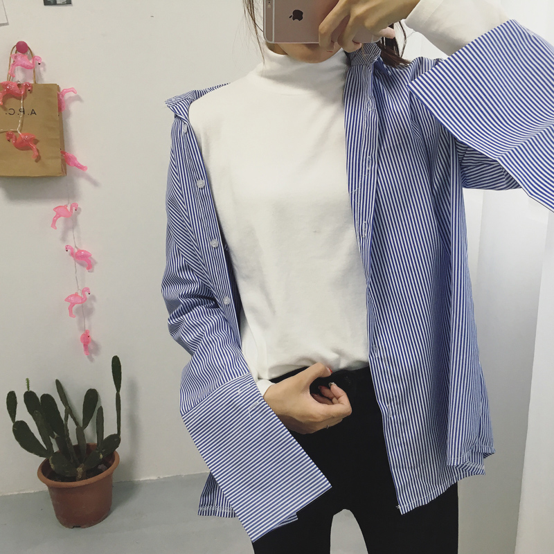 / 復古港味襯衫女長袖學生寬松原宿風bf條紋大碼喇叭袖百搭外穿襯衣