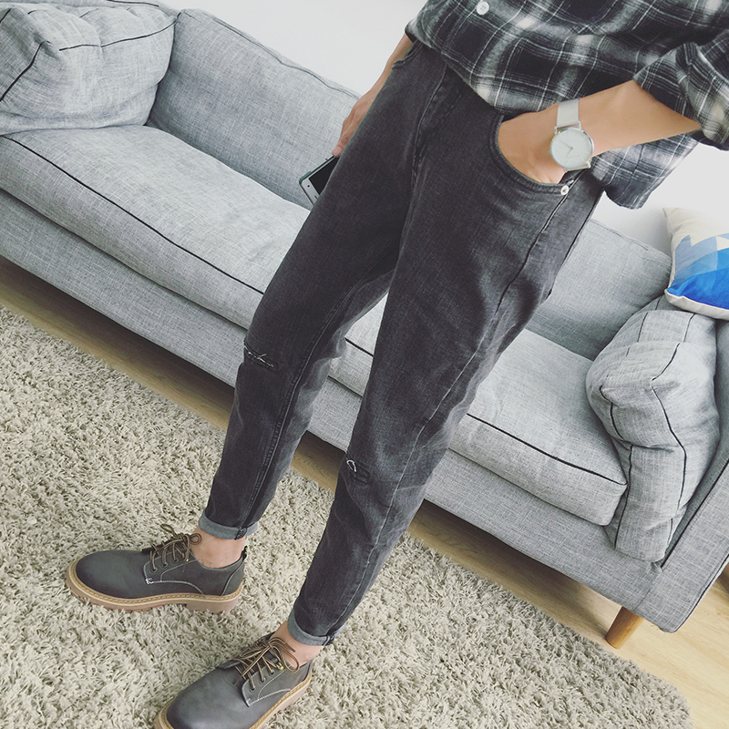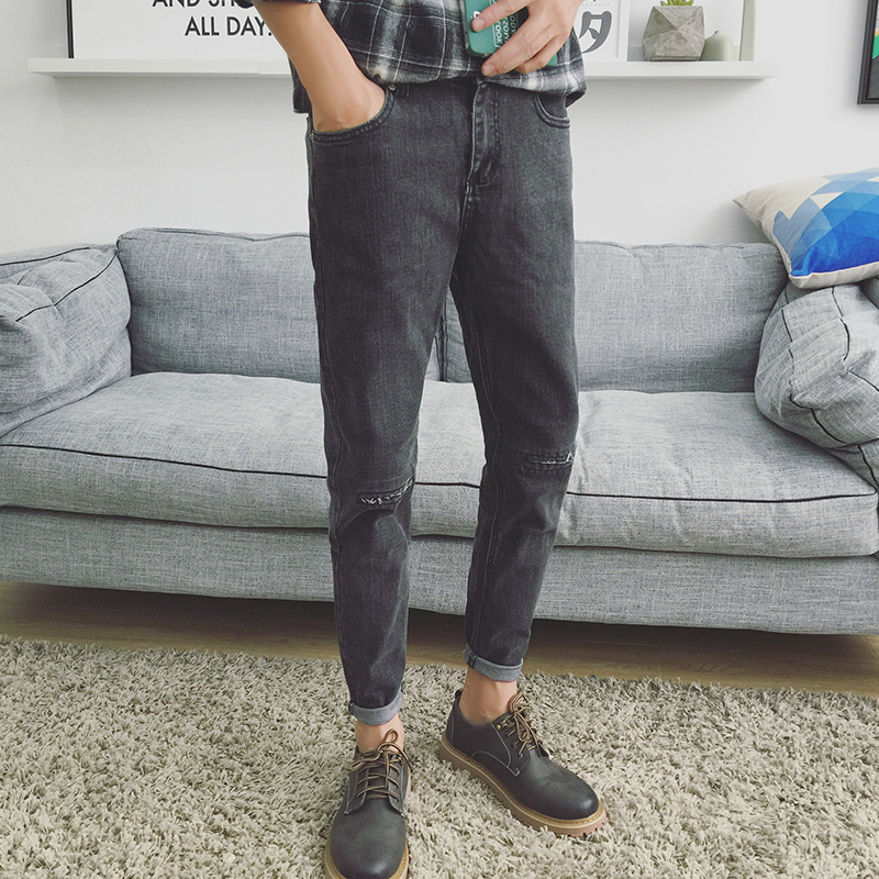 / 新款男裝韓版修身膝蓋破洞水洗男士小腳牛仔褲男褲