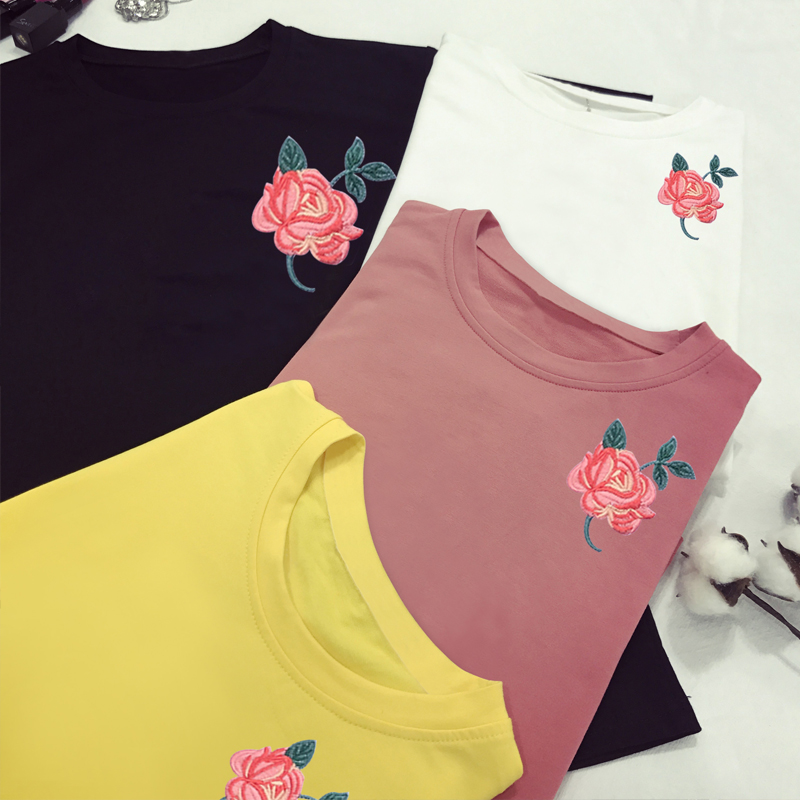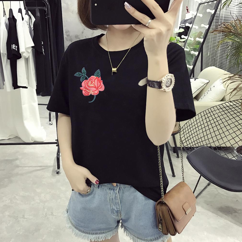 / 夏裝女裝短袖t恤女學生刺繡玫瑰花套頭小衫顯瘦大碼體恤韓版上衣