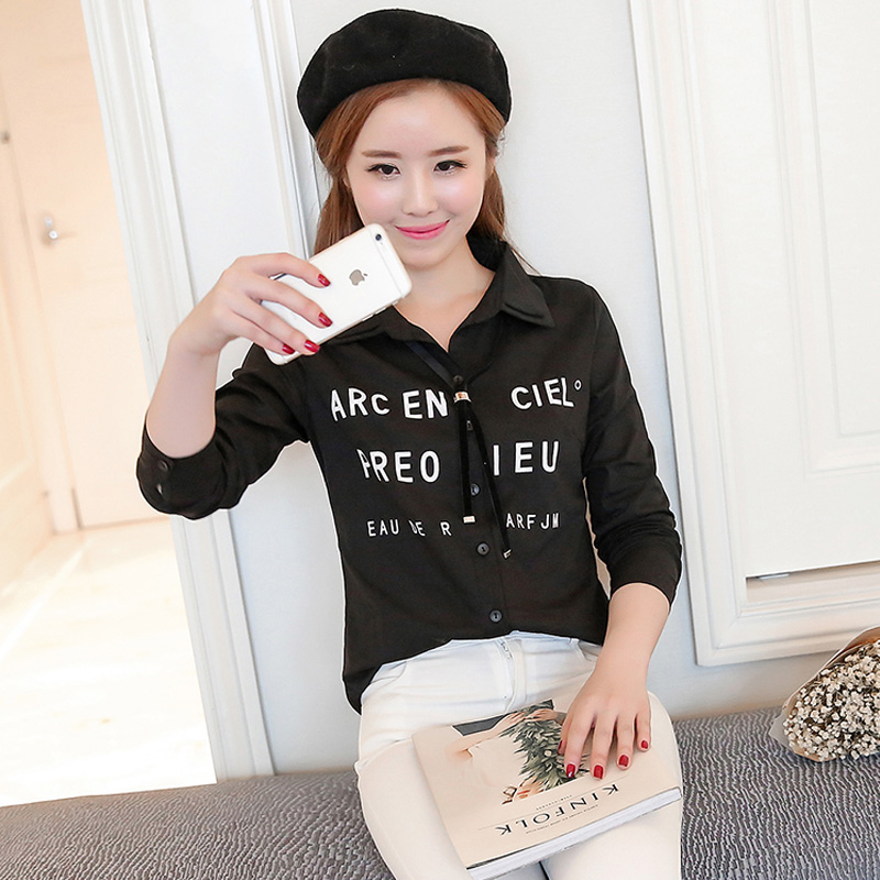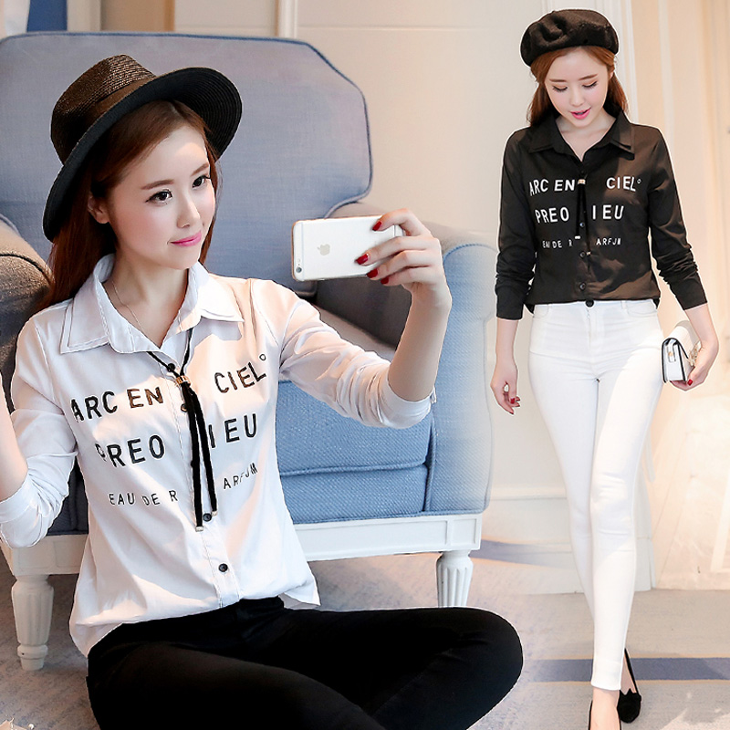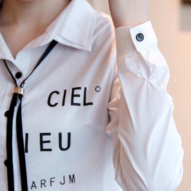 / 學院風領帶印花襯衫女長袖春裝新款韓版潮學生寬松顯瘦白襯衣