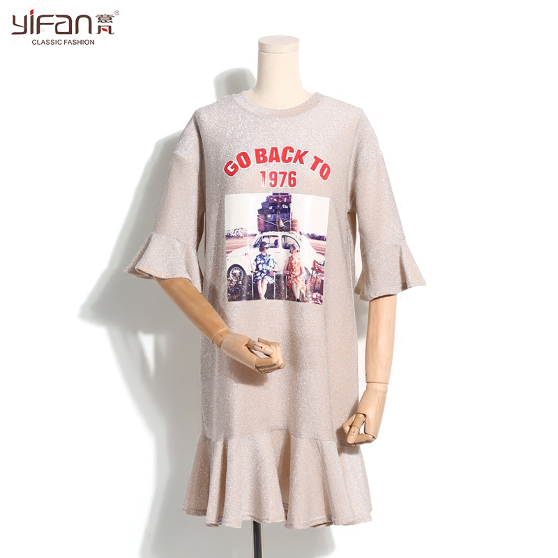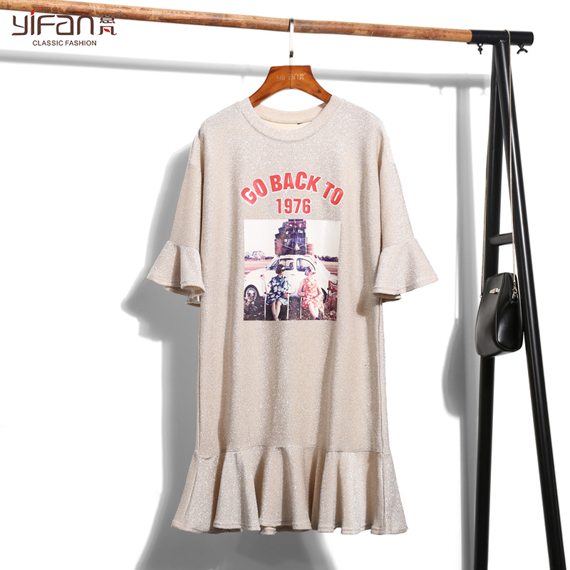 / 夏季中長款喇叭袖T恤裙女裝韓版寬松七分袖荷葉邊印花體恤裙