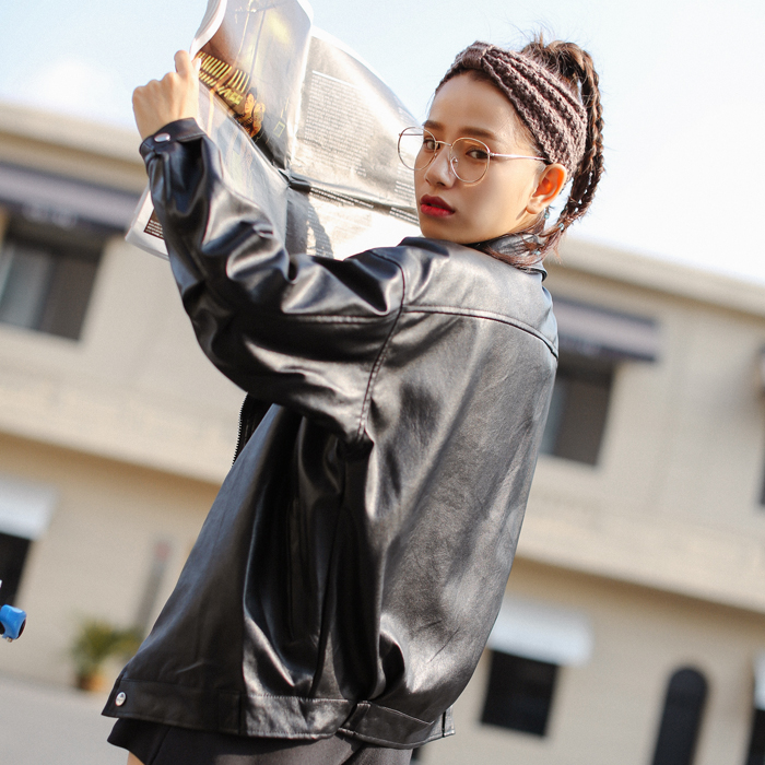 / 韓版秋冬款時尚學生寬松翻領pu仿皮外套女機車款黑色拉鏈皮衣