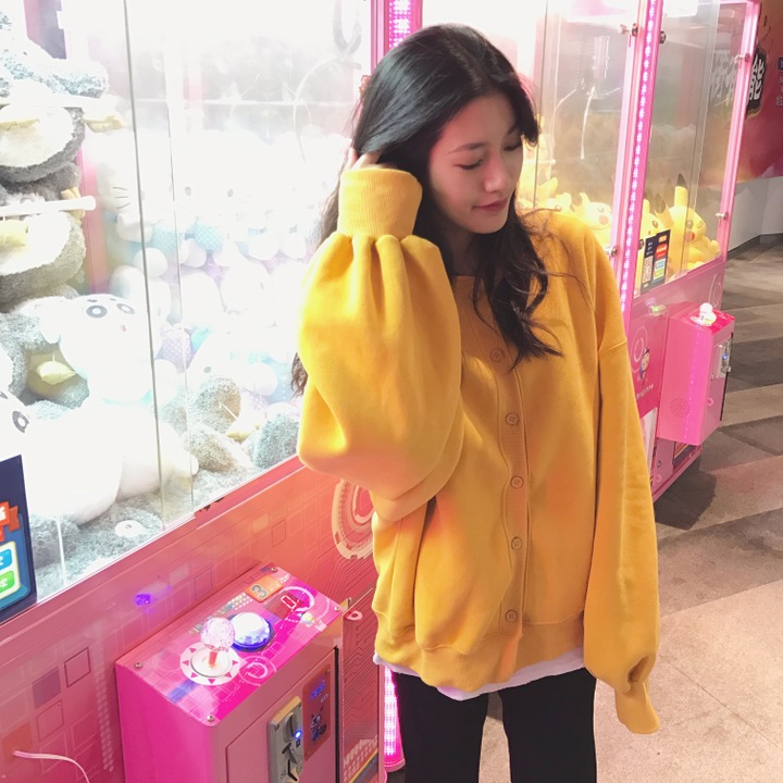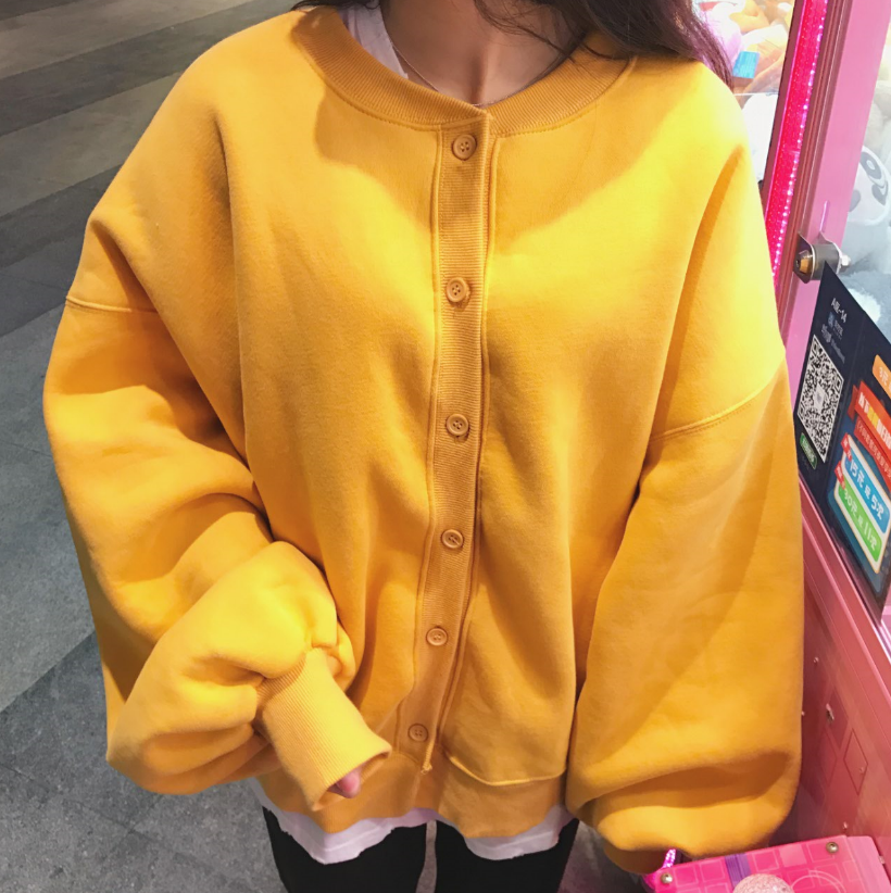 / 韓國甜美學院風秋冬寬松百搭黃色開衫泡泡袖休閑棒球服衛衣女