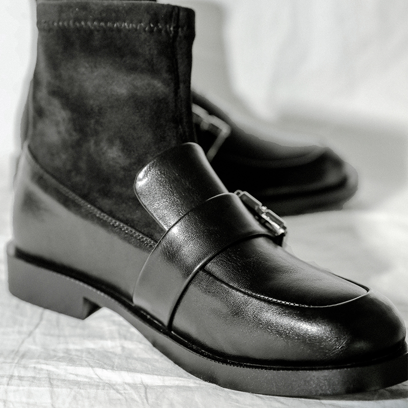 MG小象秋冬黑色短靴女2018新款個性粗跟襪子靴時尚圓頭平底鞋子潮