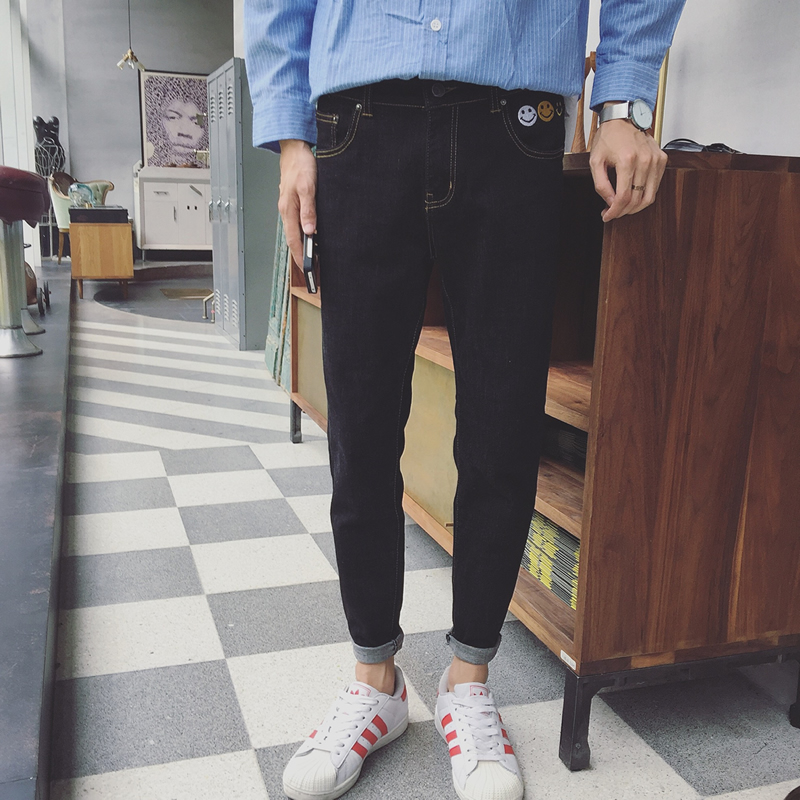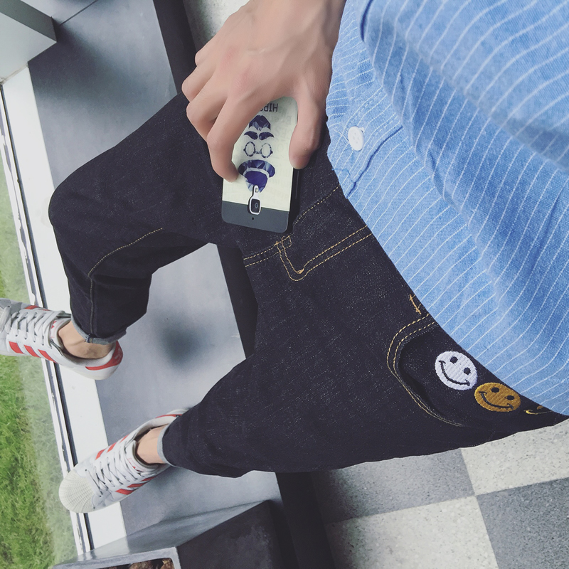 / 秋季新款黑色水洗笑臉刺繡韓版修身小腳牛仔褲男