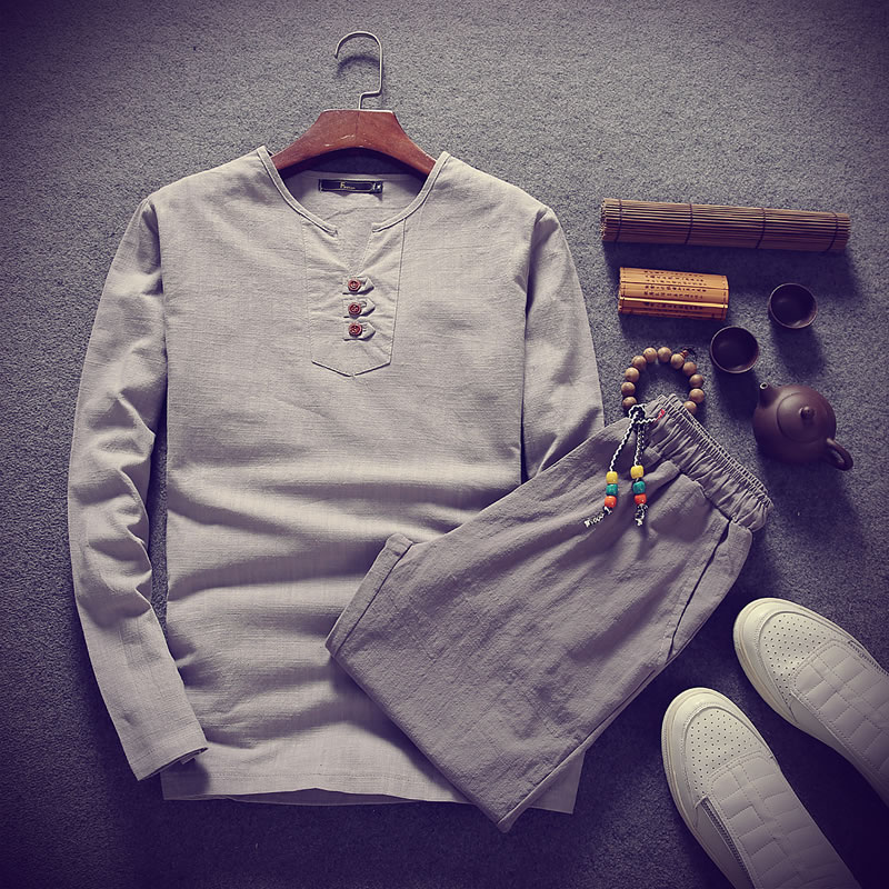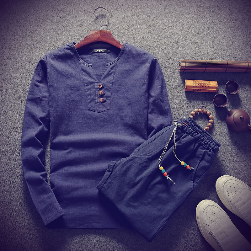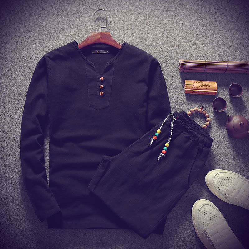 2017新款秋裝V領長袖T恤潮流大碼男帥氣時尚棉麻套裝男