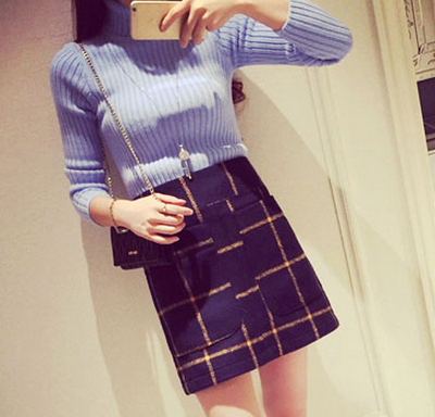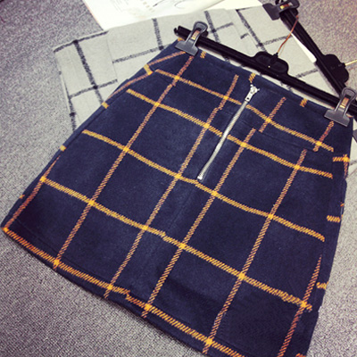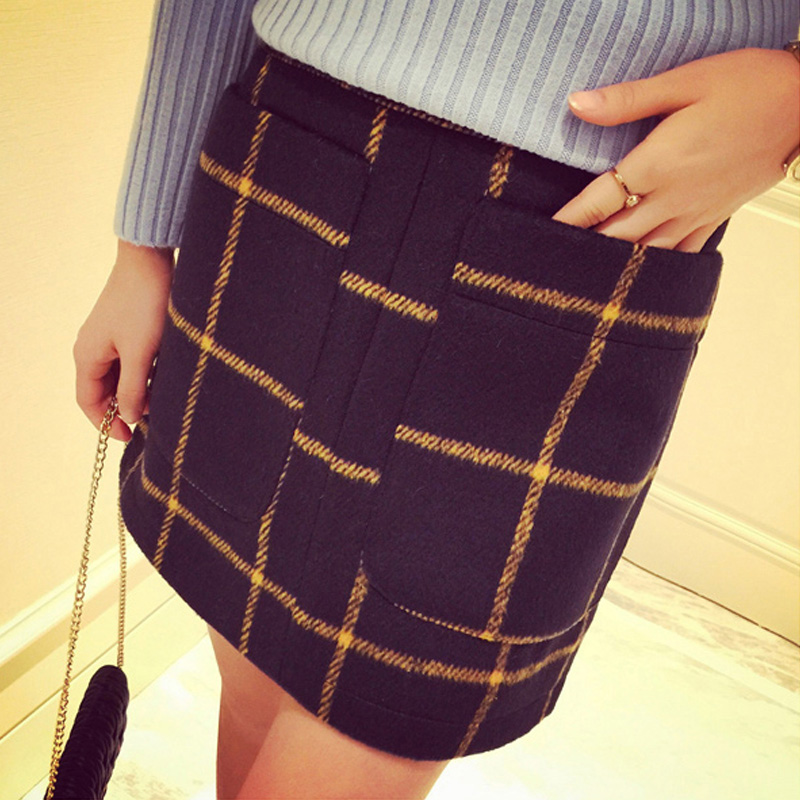 新款春秋高腰半身裙 韓版顯瘦包臀裙 毛呢格子短裙 A字呢裙女