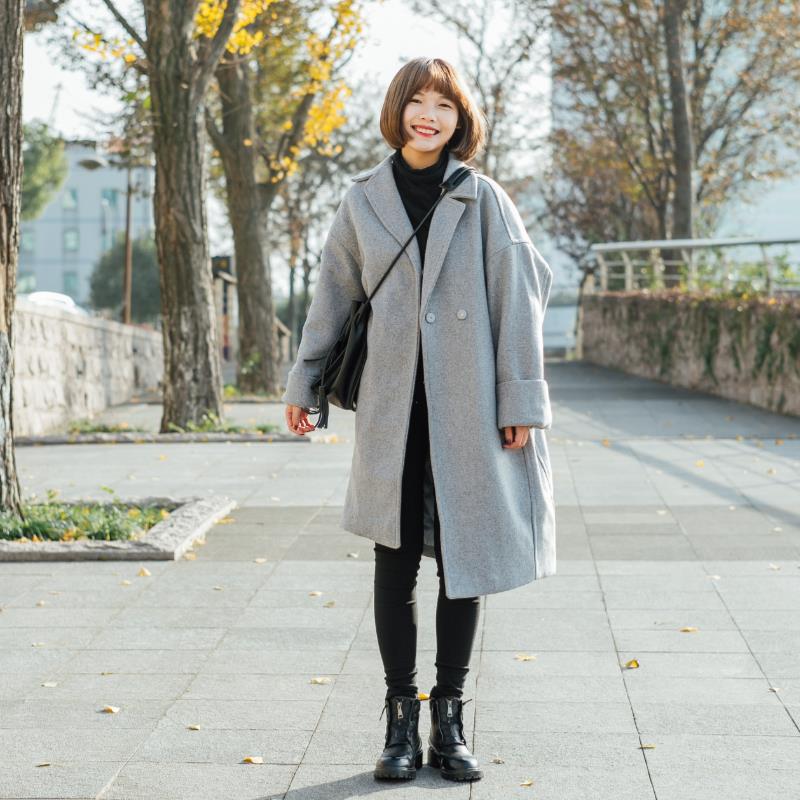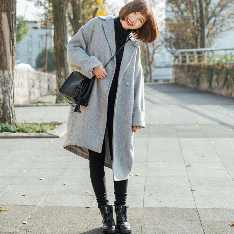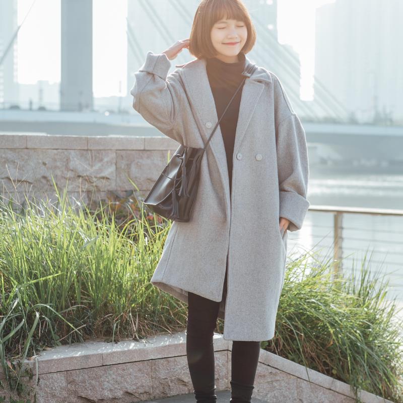 / 秋冬韓國中長款百搭時尚寬松顯瘦灰色呢子大衣長袖外套女