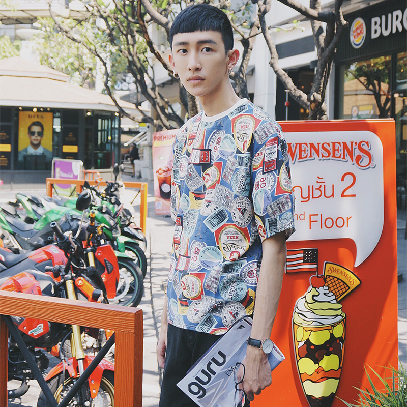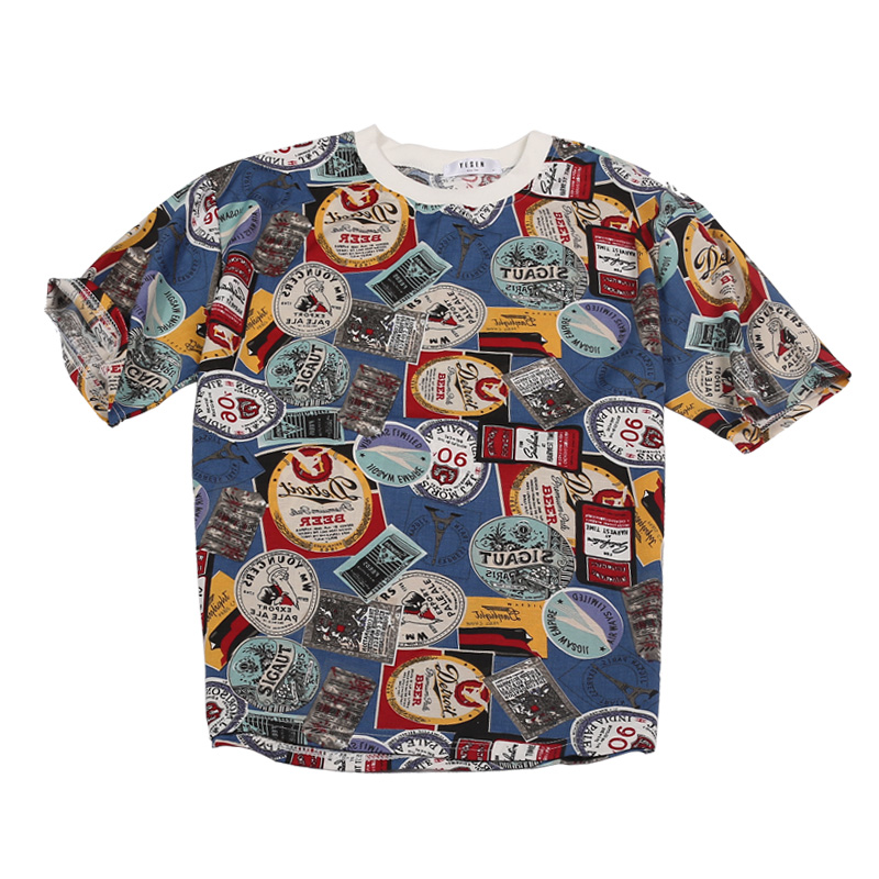 新款滿話印花韓版寬松碎花男士圓領短袖T恤潮