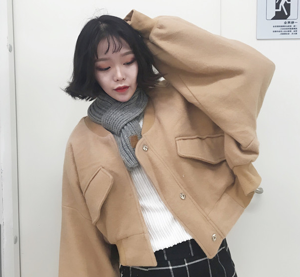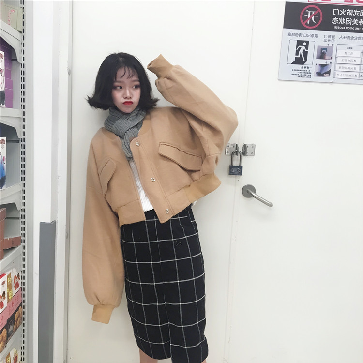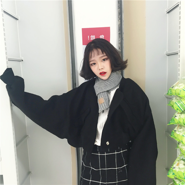 秋冬款韓國ulzzang上衣燈籠袖長袖寬松短款飛行服毛呢外套女