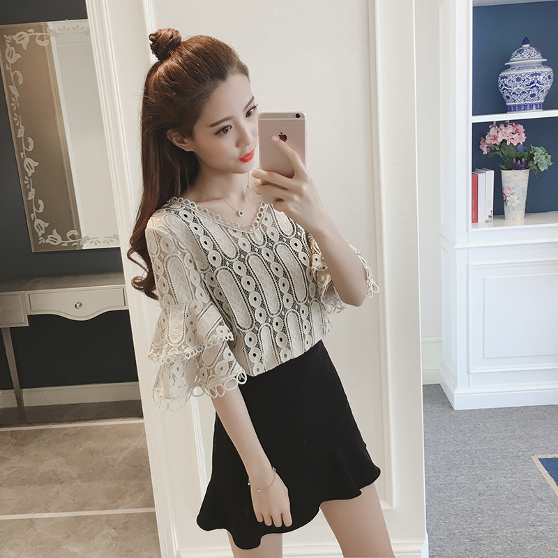 / 小衫春夏新款女裝韓版喇叭袖上衣女顯瘦百搭七分袖V領蕾絲衫