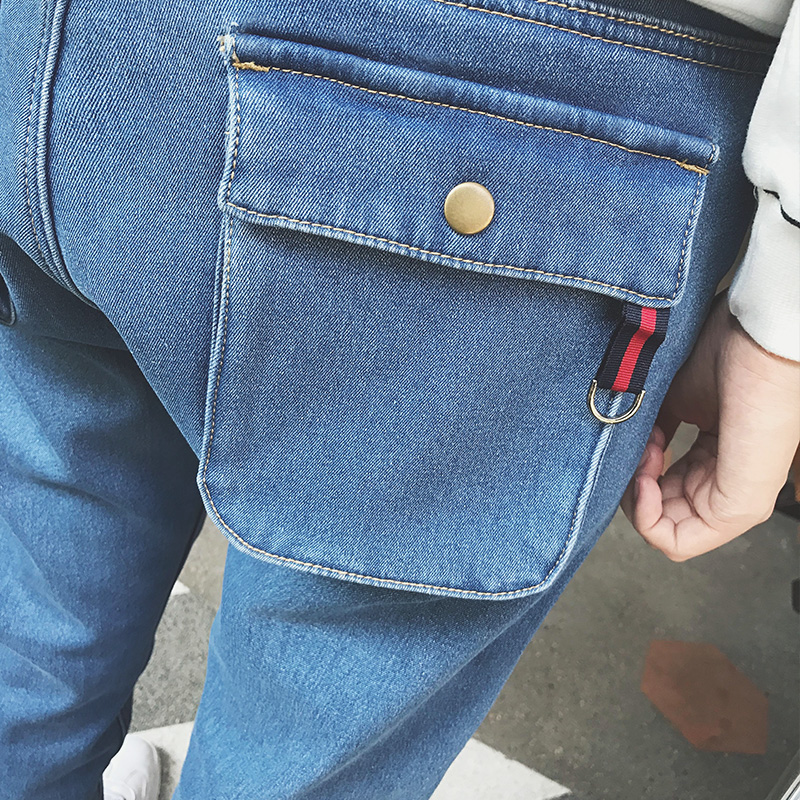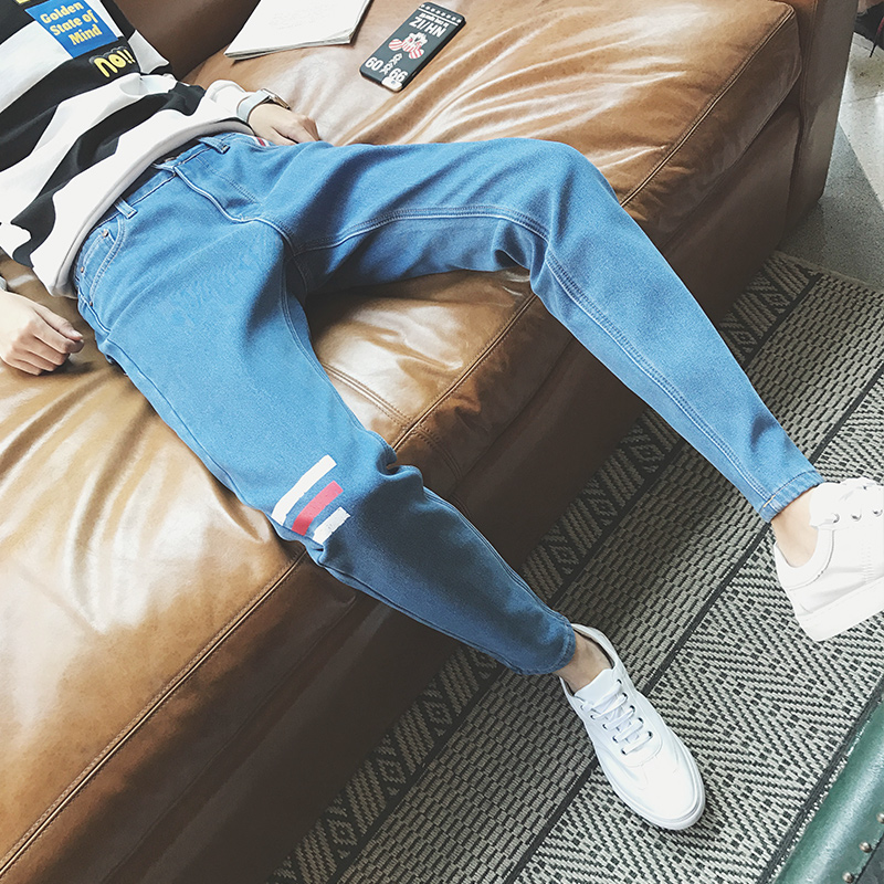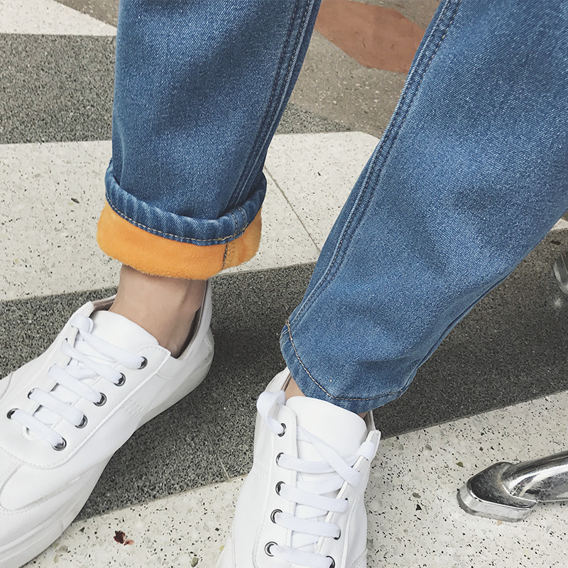 / 新款冬裝韓版撞色印花修身小腳加絨保暖男士牛仔褲
