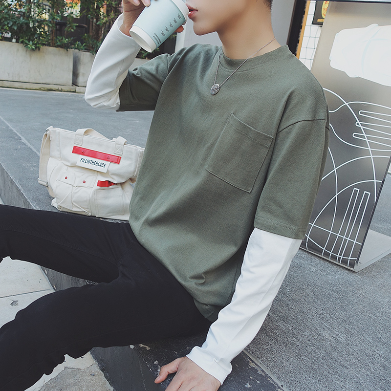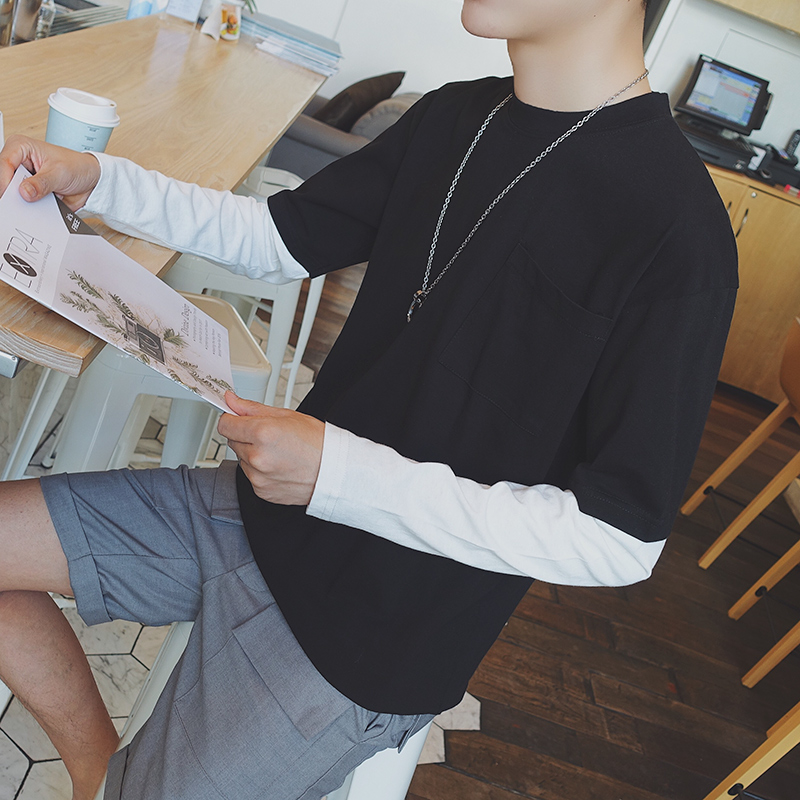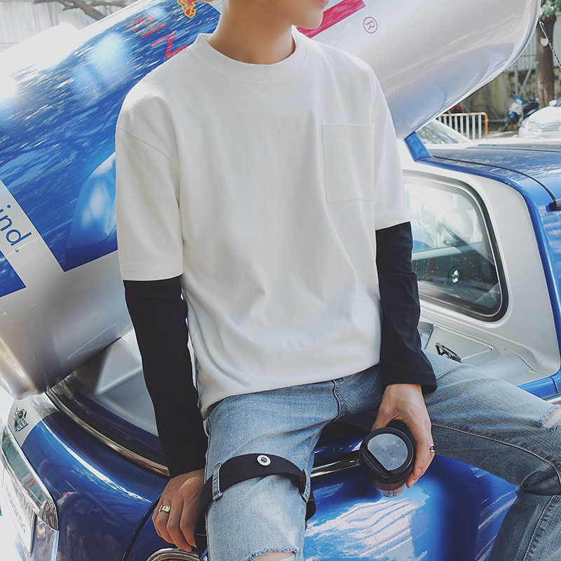 / 男裝韓版時尚學生打底衫修身圓領男士假兩件長袖T恤
