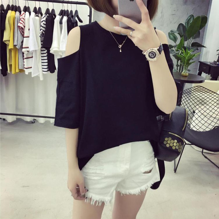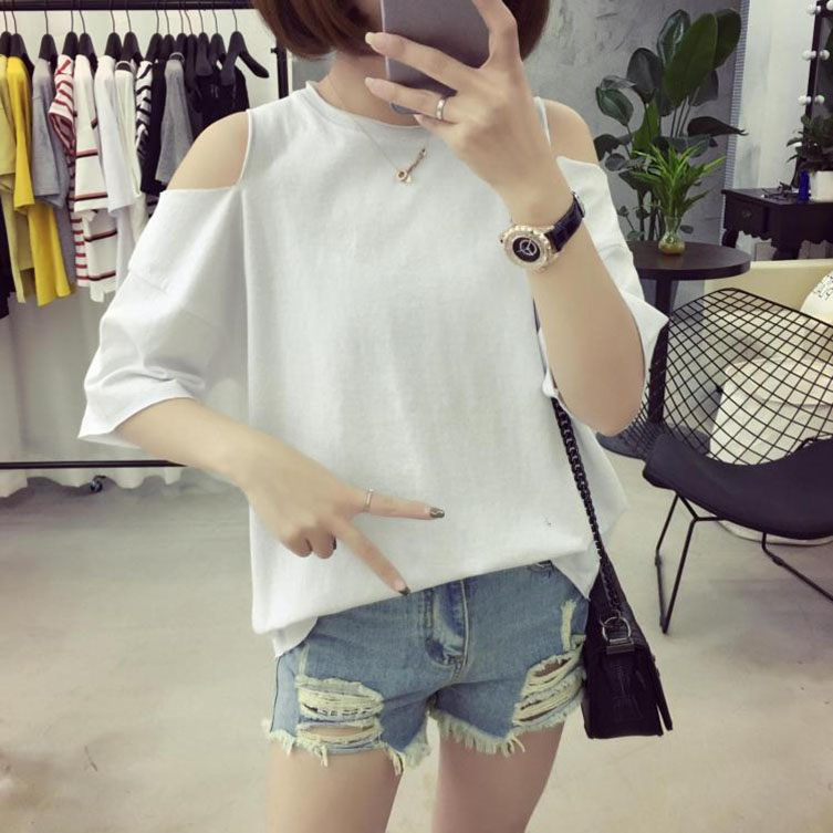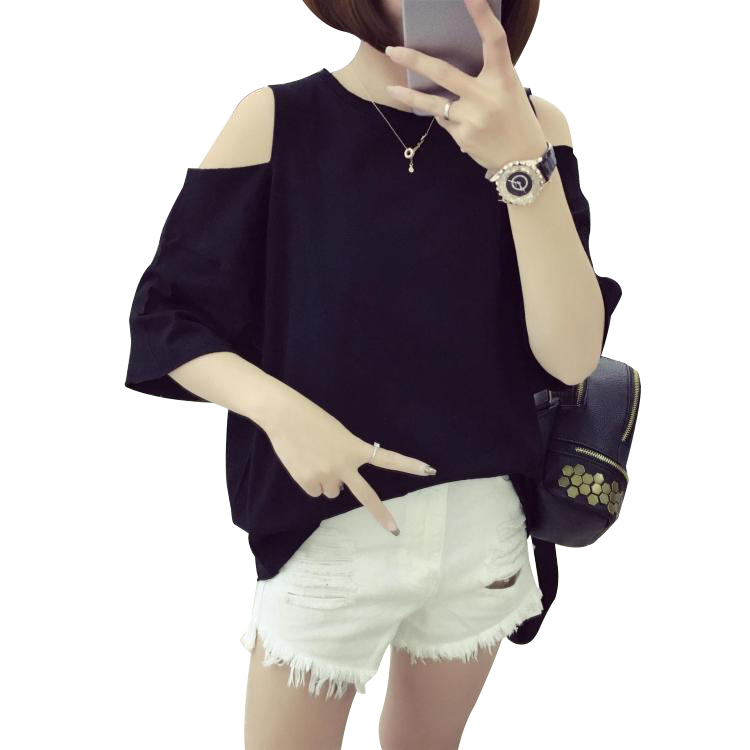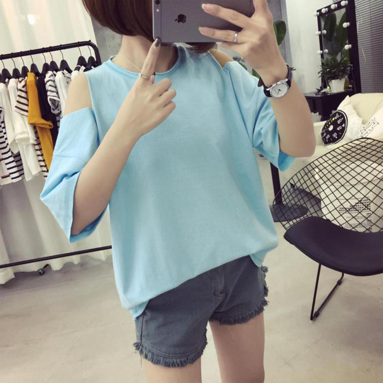/ 女裝夏裝性感露肩上衣純色打底t恤女百搭夏季學生短袖大碼潮