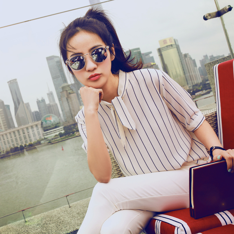 / 女雪紡衫襯衫女短袖上衣韓版豎條紋百搭學生閨蜜裝夏天衣服女裝潮