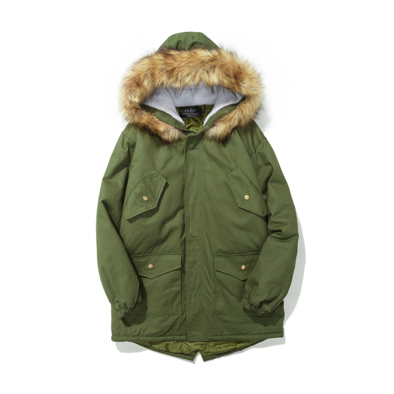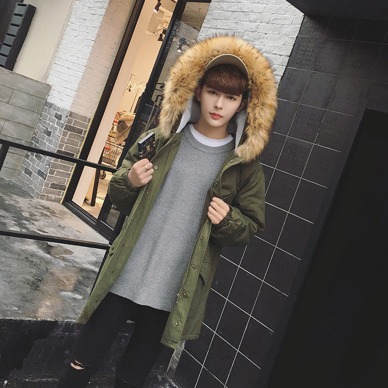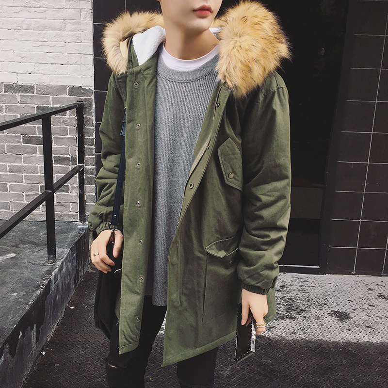 男裝學院風大毛領男士軍綠色長款連帽寬松風衣外套