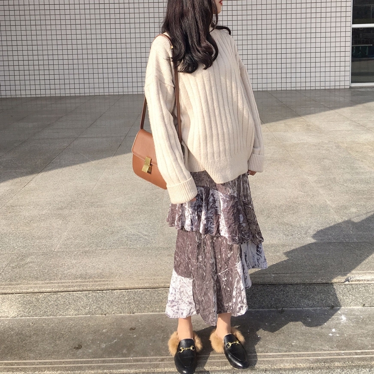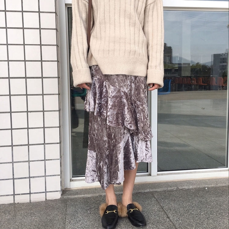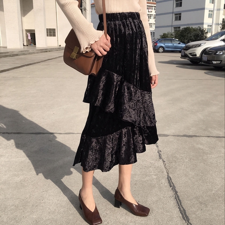 / 韓國秋冬款純色松緊腰絲絨中長款荷葉邊不規則下擺半身裙女