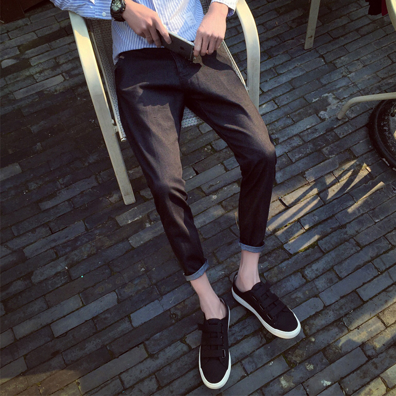秋裝韓版秋季修身純色小直腳男士九分褲牛仔褲