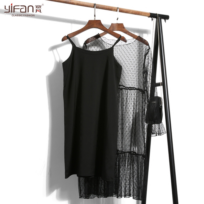 / 春夏雪紡波點鏤空中長款連衣裙修身打底吊帶背心蕾絲裙兩件套