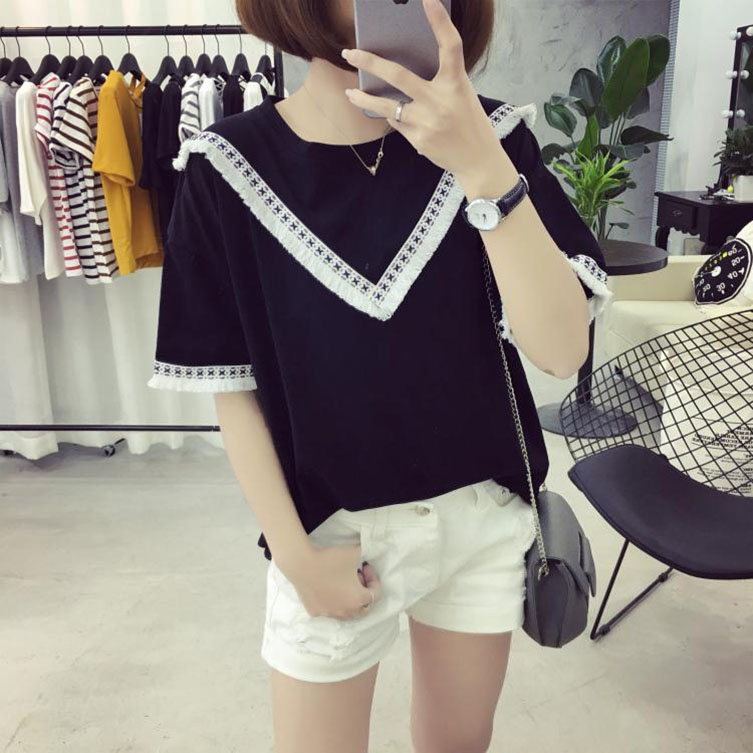 韓國新款學院風短款夏季短袖上衣復古t恤衫女裝大碼寬松春裝體恤