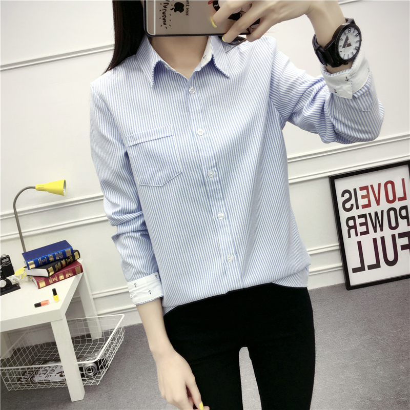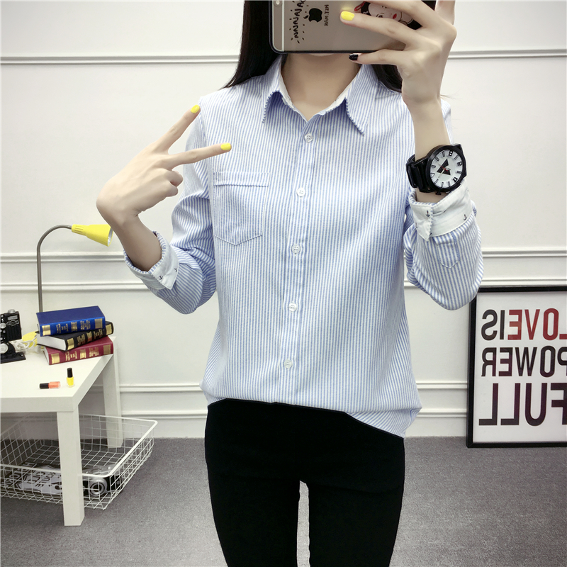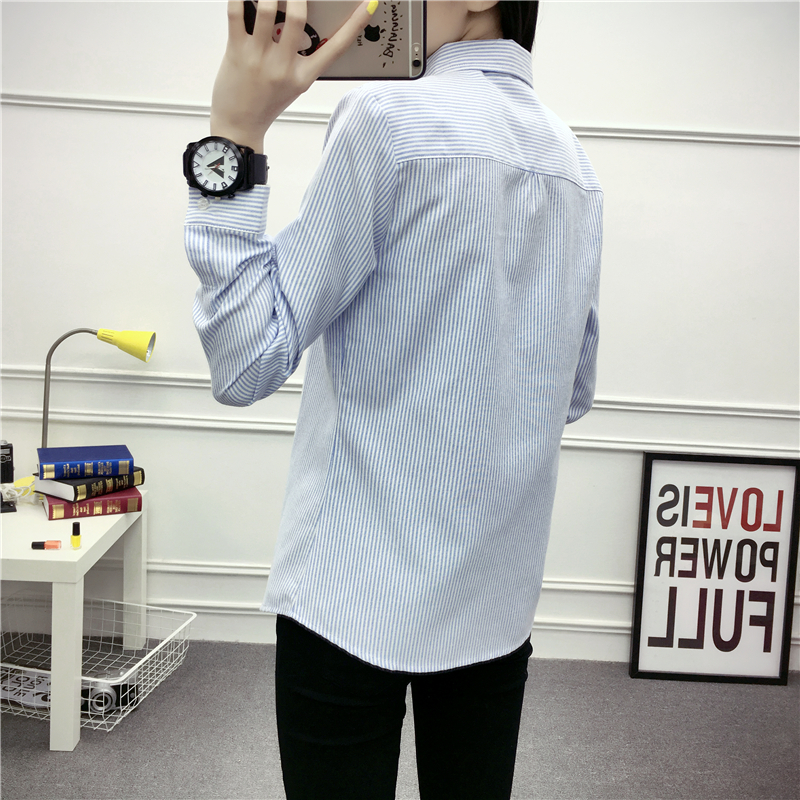 / POLO領豎條紋襯衫女長袖韓范秋季時尚學生寬松百搭學院風刺繡襯衣