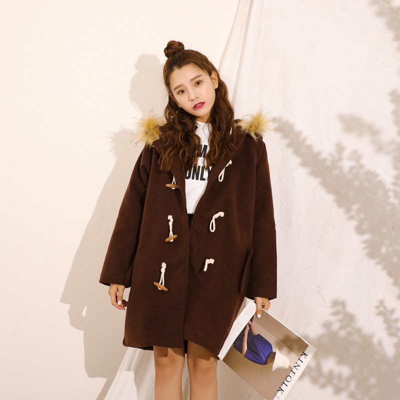 冬款韓國chic牛角扣夾棉加厚中長款連帽毛領毛呢外套大衣女