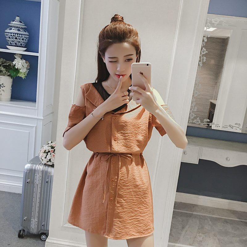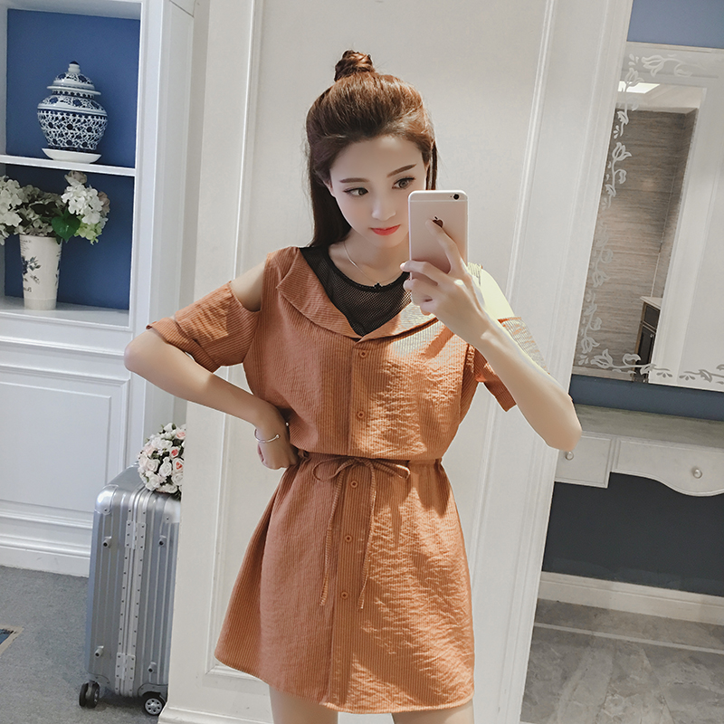 夏季新款女裝韓版時尚網紗拼接打底裙寬松顯瘦短袖露肩連衣裙