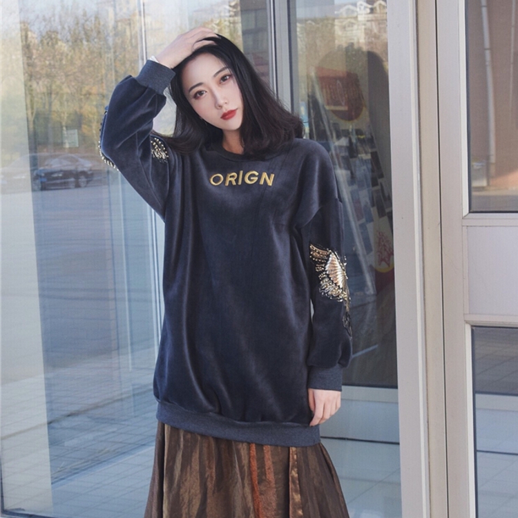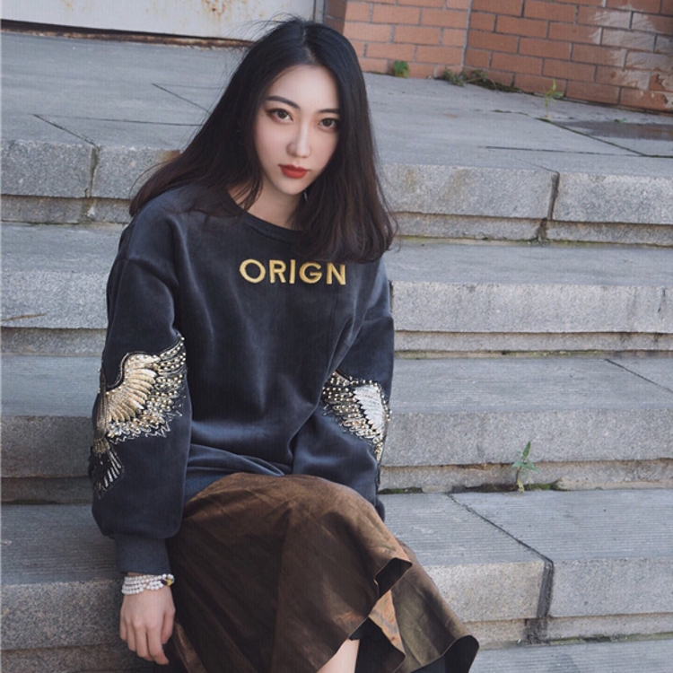 高檔絲絨面料 加上胸前的圖案字母刺繡和袖子的老鷹釘珠刺繡